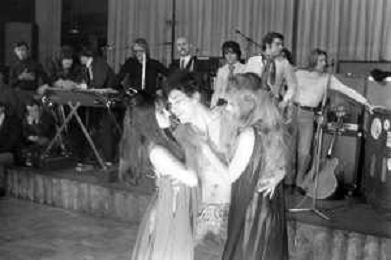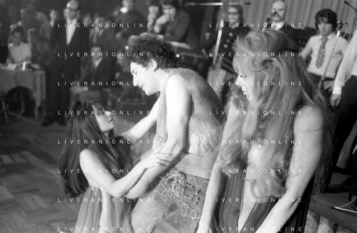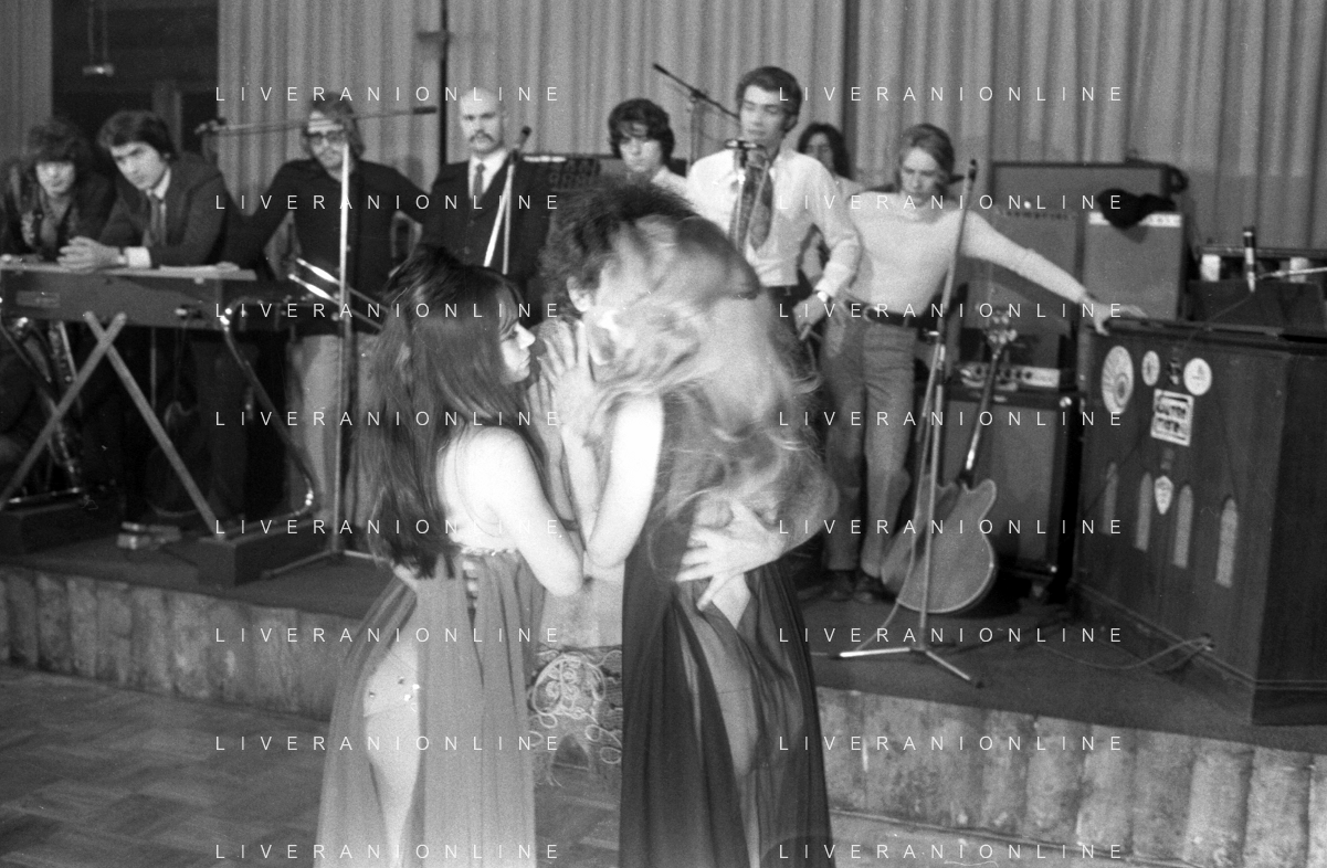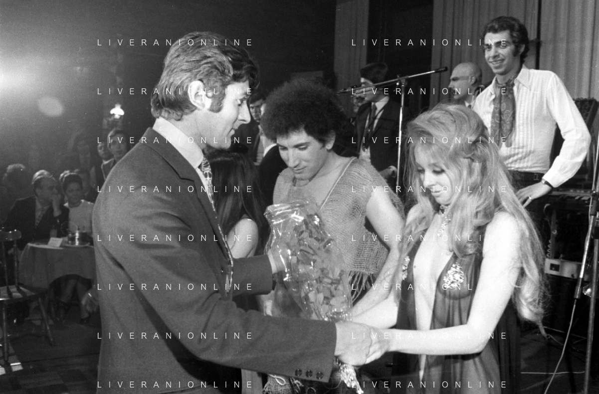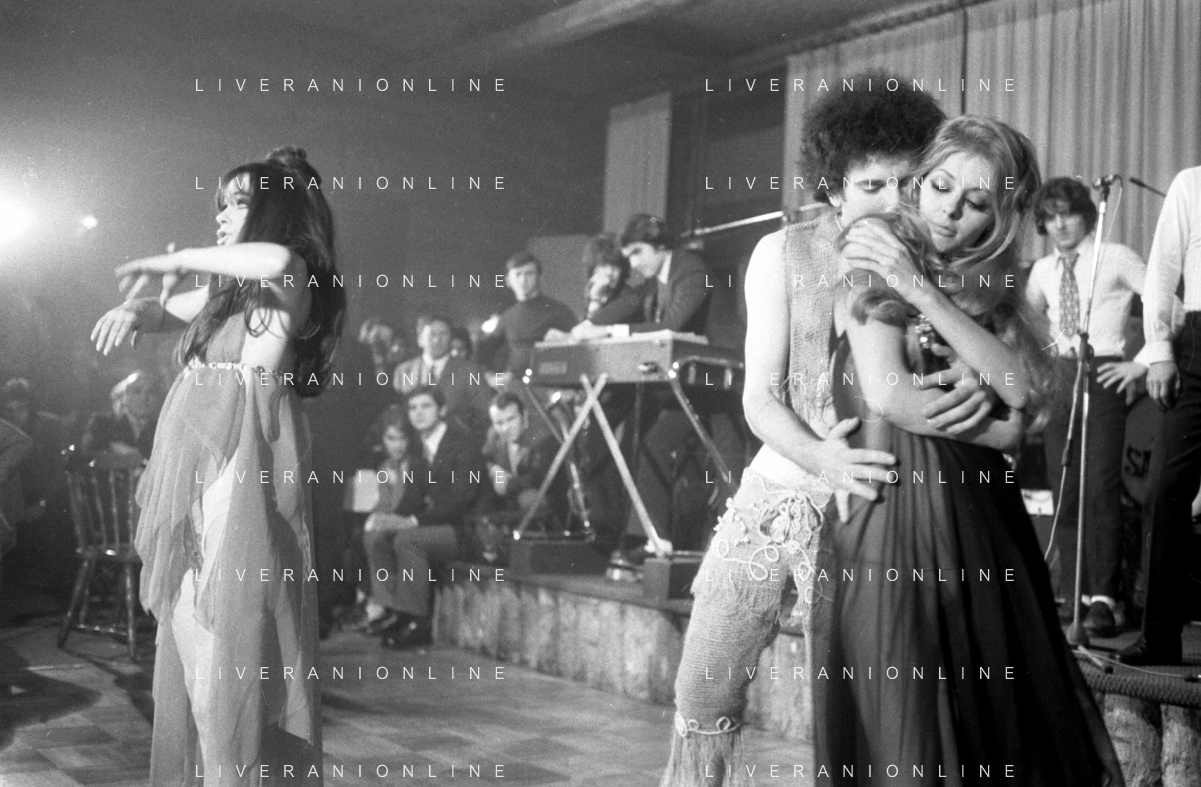Neg- RETROSPETTIVA VITTORIA SOLINAS (MARIA SOLE) CANTANTE E ATTRICE NELLA FOTO CON IL MARITO ARMANDO STULA E LA SORELLA MARISA DURANTE UNA ESIBIZIONE A MILANO NELL'ANNO 1970 AG ALDO LIVERANI SAS