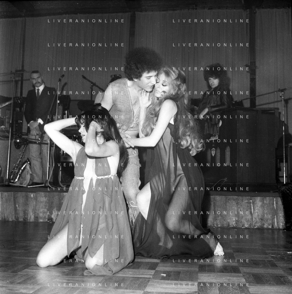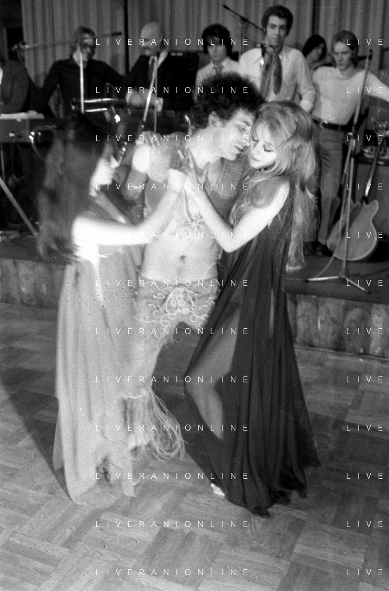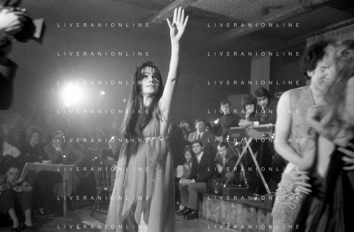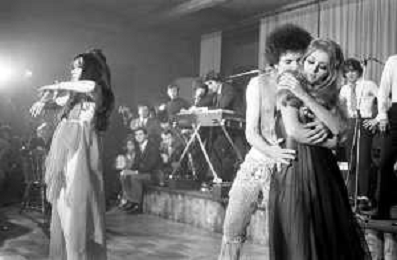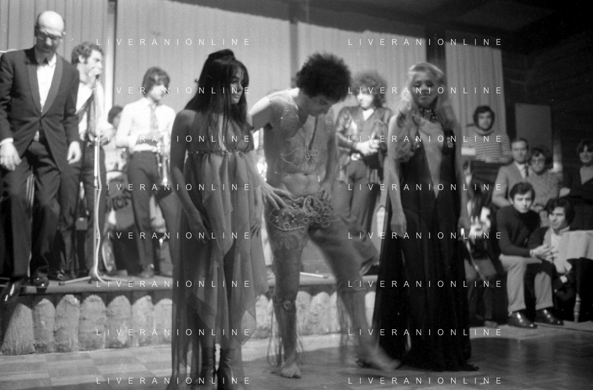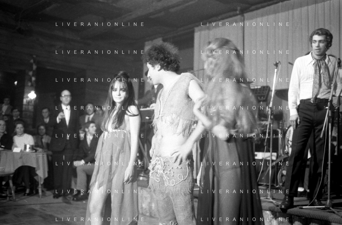 Neg- RETROSPETTIVA VITTORIA SOLINAS (MARIA SOLE) CANTANTE E ATTRICE NELLA FOTO CON IL MARITO ARMANDO STULA E LA SORELLA MARISA DURANTE UNA ESIBIZIONE A MILANO NELL'ANNO 1970 AG ALDO LIVERANI SAS