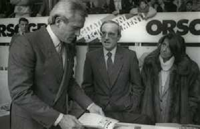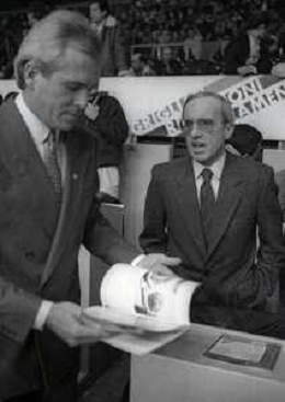 RETROSPETTIVA DAN PETERSON ALLENATORE BASKET NELLA FOTO DAN PETERSON ALLENATORE NELL'ANNO 1987 A MILANO ALLA PREMIAZIONE DELL'AOSCAR DELLO SPORT CON FRANCESCO MOSER AG ALDO LIVERANI SAS