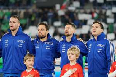 Federico Gatti of Italy, Giacomo Bonaventura of Italy, Jorginho of Italy and Federico Chiesa of Italy line up during the National Anthems prior the UEFA EURO 2024 European qualifier match between Italy and North Macedonia at Stadio Olimpico on November 17, 2023 in Rome, Italy. Photo by Emmanuele Mastrodonato/ag. Aldo Liverani sas