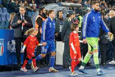 Nicolò Barella of Italy and Gianluigi Donnarumma of Italy enter the field during the UEFA EURO 2024 European qualifier match between Italy and North Macedonia at Stadio Olimpico on November 17, 2023 in Rome, Italy. Photo by Emmanuele Mastrodonato/ag. Aldo Liverani sas