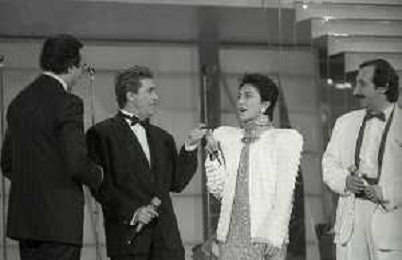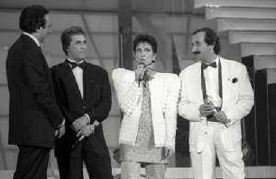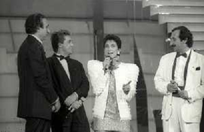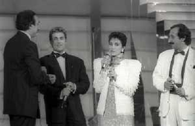 NEG-RETROSPETTIVA RICCHI E POVERI COMPLESSO MUSICALE NELLA FOTO I RICCHI E POVERI AL FESTIVAL DI SANREMO NELL'ANNO 1987-ANGELO SOTGIU-ANGELA BRAMBATI FRANCO GATTI CON PIPPO BAUDO AG ALDO LIVERANI SAS