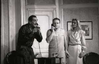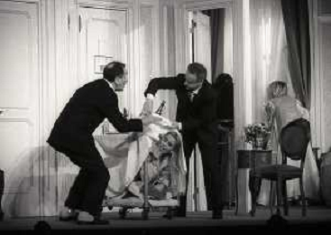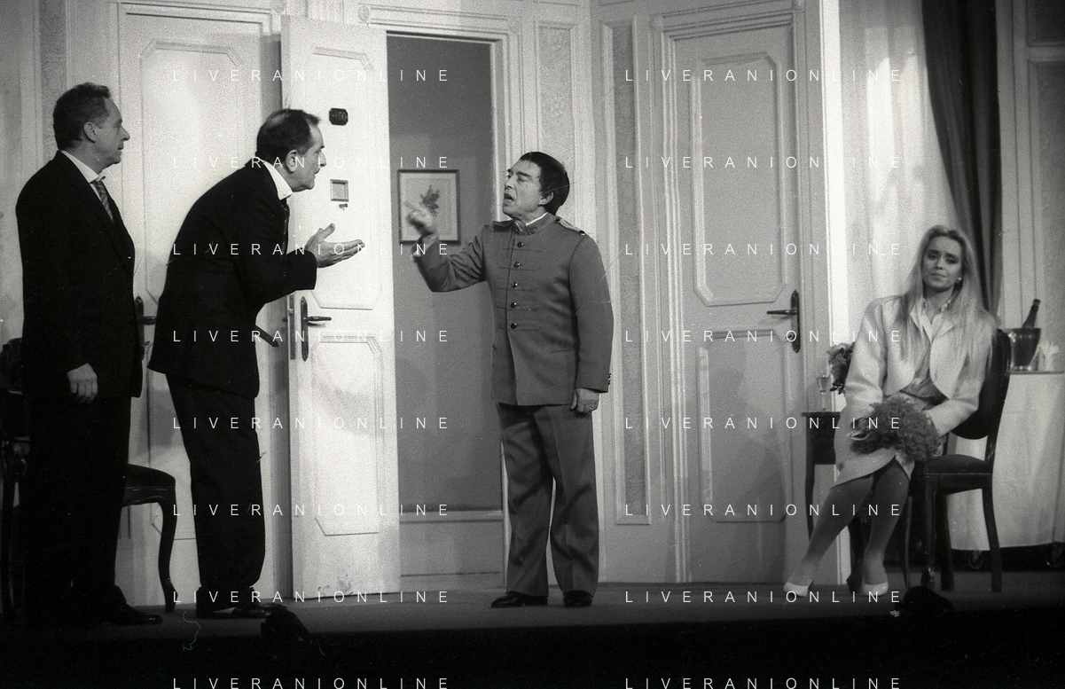 NEG-RETROSPETTIVA JOHNNY DORELLI ATTORE NELLA FOTO JOHNNY DORELLI CON GLORIA GUIDA -PAOLA QUATTRINI E RICCARDO GARRONE NELLA COMMEDIA TEATRALE“ SE DEVI DIRE UNA BUGIA DILLA GROSSA“A MILANO NELL'ANNO 1985 AG ALDO LIVERANI SAS