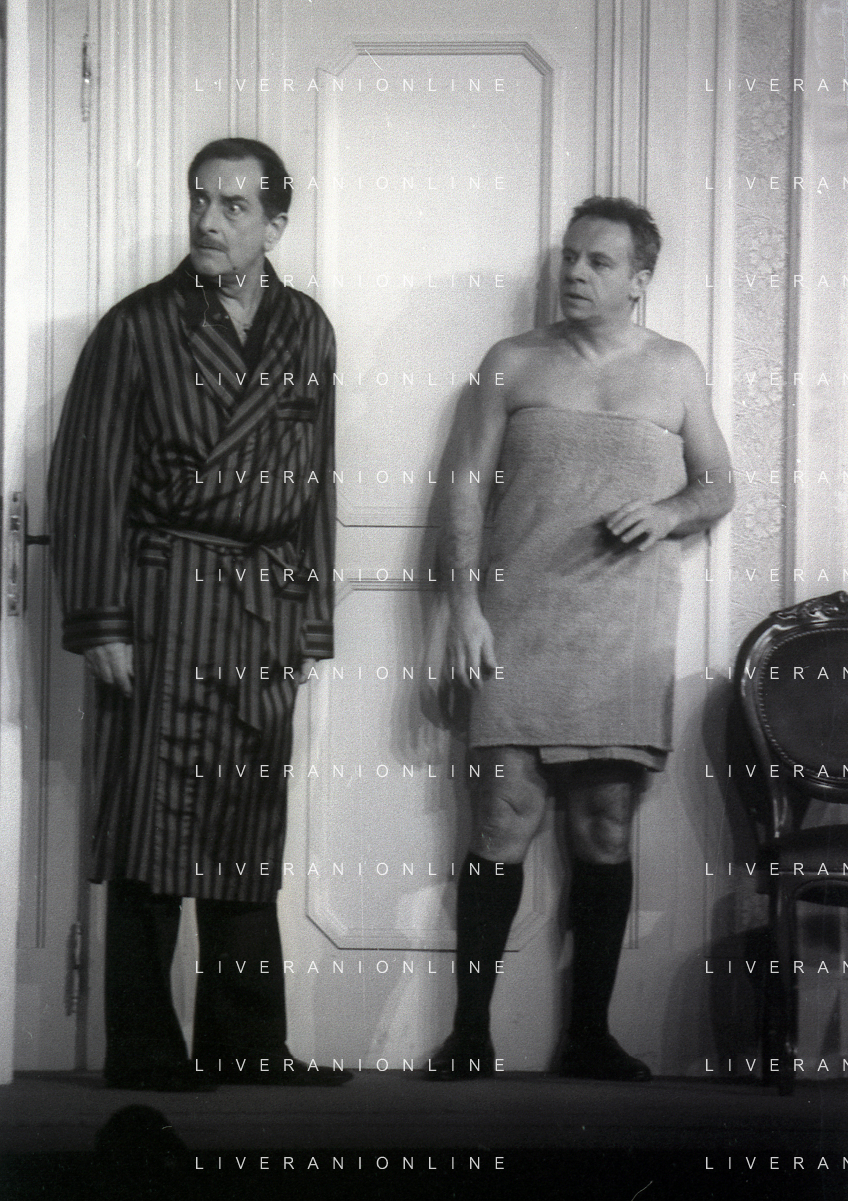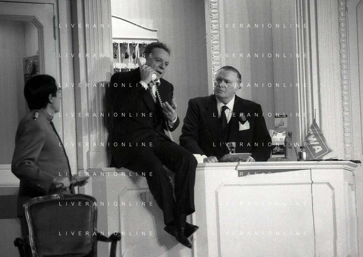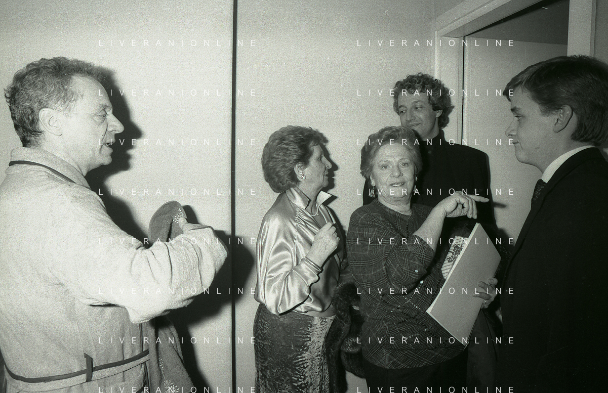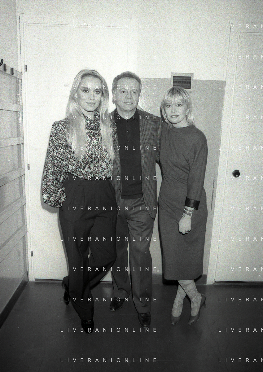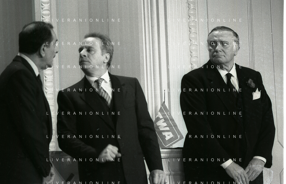NEG-RETROSPETTIVA JOHNNY DORELLI ATTORE NELLA FOTO JOHNNY DORELLI CON GLORIA GUIDA -PAOLA QUATTRINI E RICCARDO GARRONE NELLA COMMEDIA TEATRALE“ SE DEVI DIRE UNA BUGIA DILLA GROSSA“A MILANO NELL'ANNO 1985 JOHNNY DORELLI CON ENRICO BERUSCHI AG ALDO LIVERANI SAS