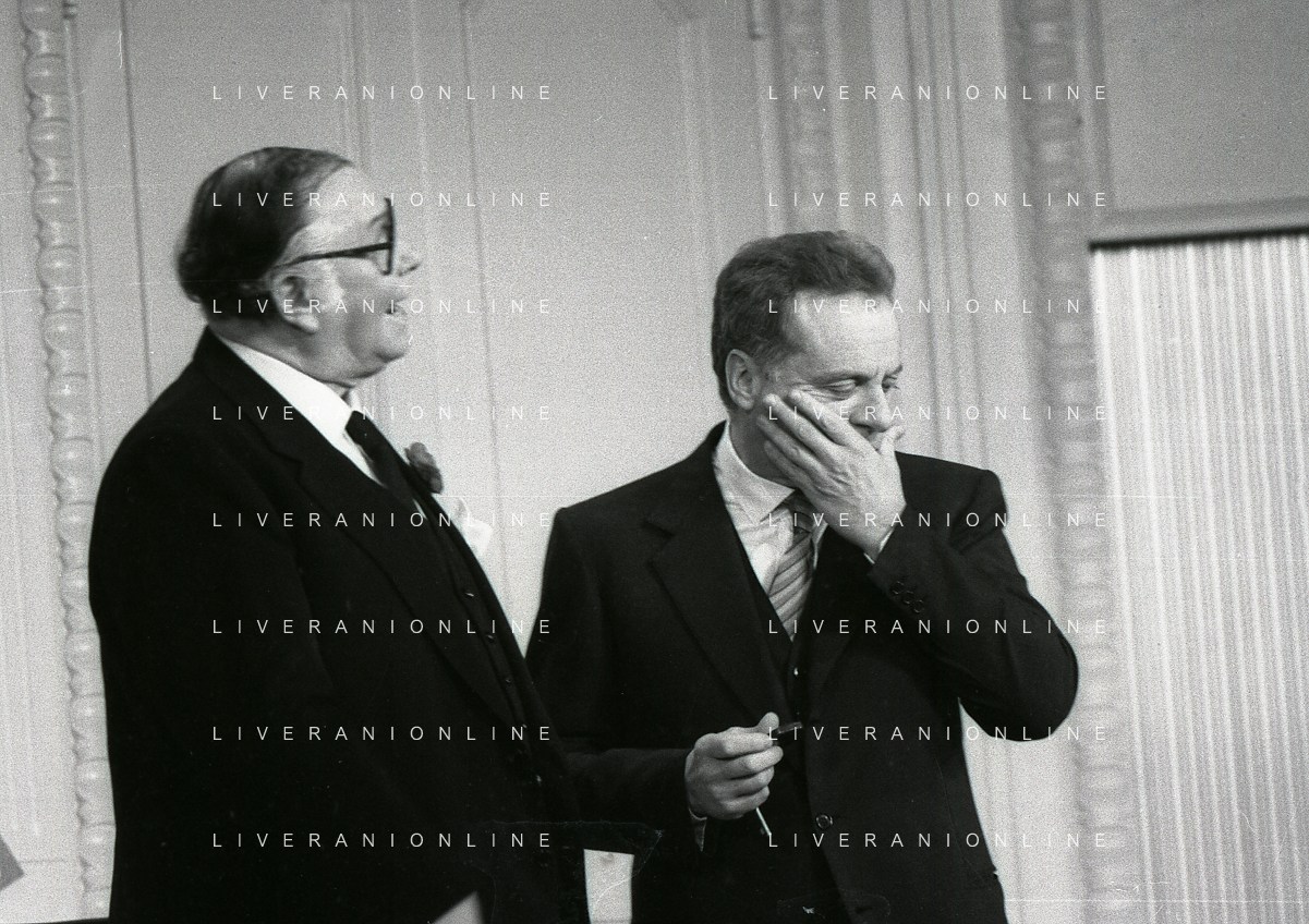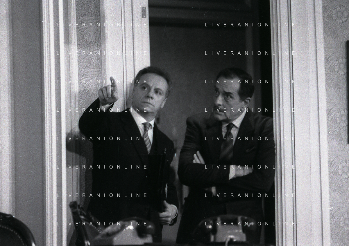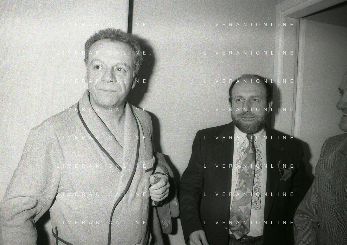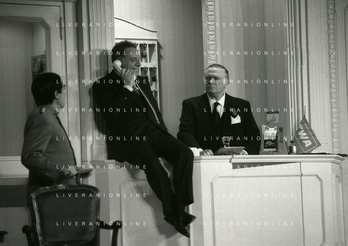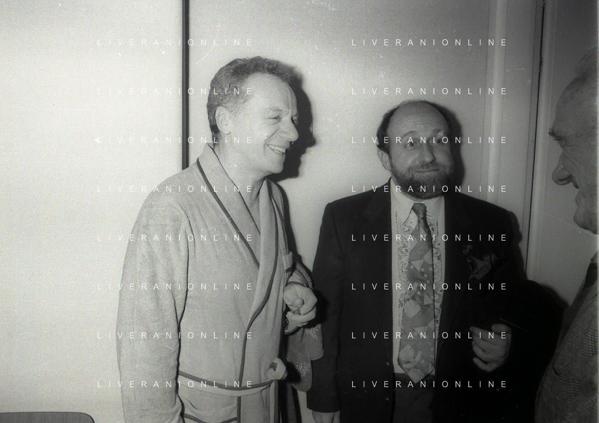 NEG-RETROSPETTIVA JOHNNY DORELLI ATTORE NELLA FOTO JOHNNY DORELLI CON GLORIA GUIDA -PAOLA QUATTRINI E RICCARDO GARRONE NELLA COMMEDIA TEATRALE“ SE DEVI DIRE UNA BUGIA DILLA GROSSA“A MILANO NELL'ANNO 1985 JOHNNY DORELLI CON ENRICO BERUSCHI AG ALDO LIVERANI SAS