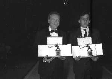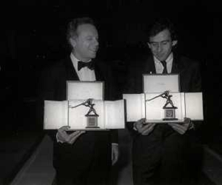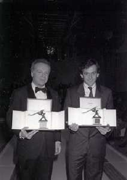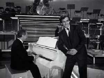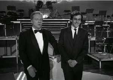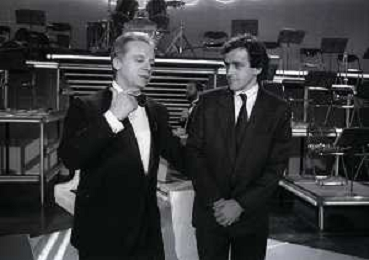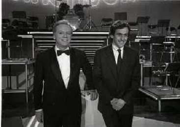 NEG-RETROSPETTIVA JOHNNY DORELLI ATTORE NELLA FOTO JOHNNY DORELLI CON MICHEL PLATINI A MILANO NELL'ANNO 1985 NELLA TRASMISSIONE TELEVISIVA “PREMIATISSIMA“ AG ALDO LIVERANI SAS