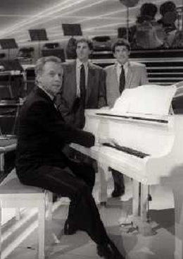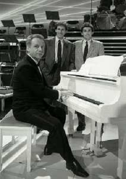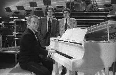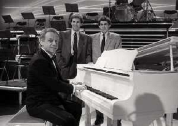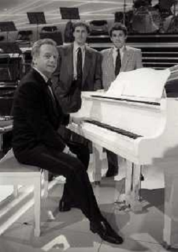 NEG-RETROSPETTIVA JOHNNY DORELLI ATTORE NELLA FOTO JOHNNY DORELLI CON FRANCO E GIUSEPPE BARESI A MILANO NELL'ANNO 1985 NELLA TRASMISSIONE TELEVISIVA “PREMIATISSIMA“ AG ALDO LIVERANI SAS