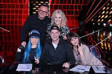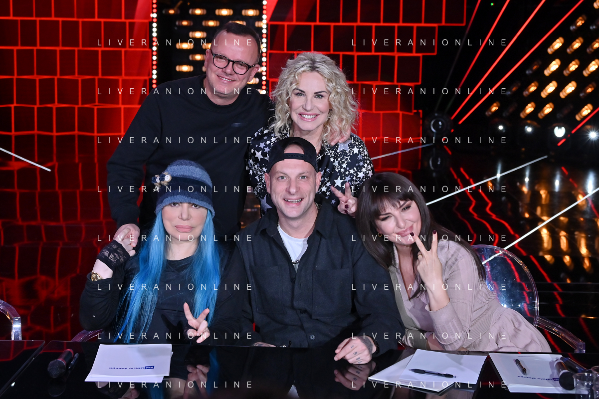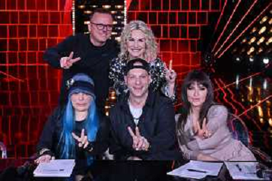 TVRG Photocall The Voice Kids nella foto in piedi da SX Gigi D'Alessio e Antonella Clerici; in basso da SX Loredana Berte', Clementino e Arisa Milano 23-11-2023 Photocall in occasione della conferenza stampa di presentazione di The Voice Kids foto Roberto Garavaglia/ag. Aldo Liverani sas