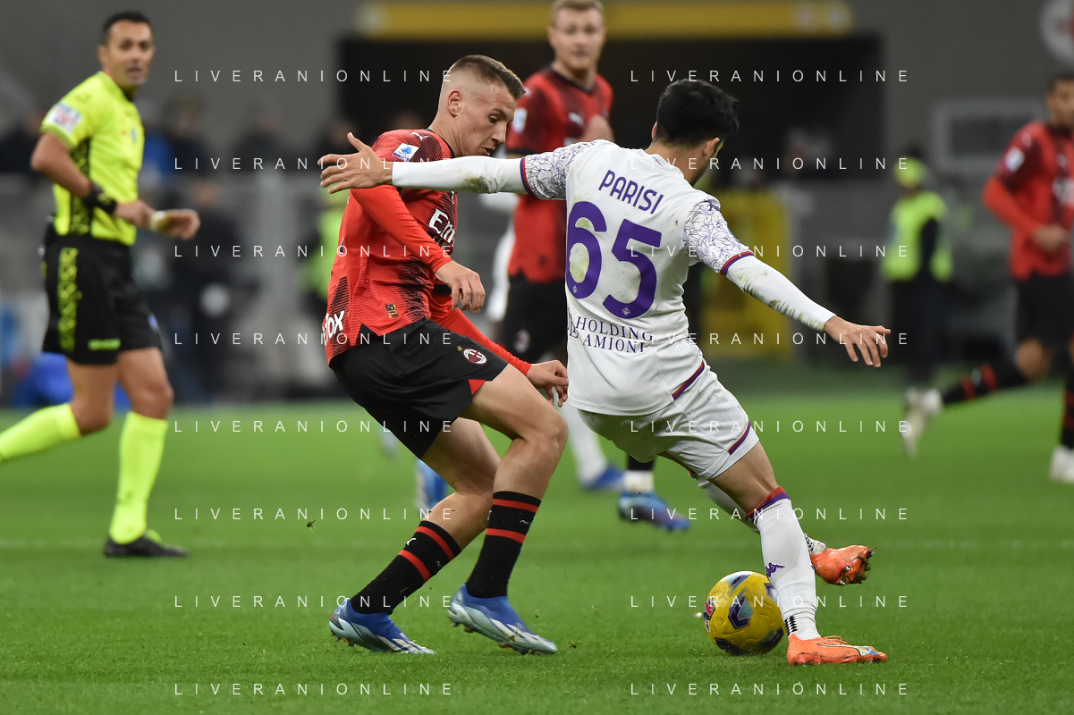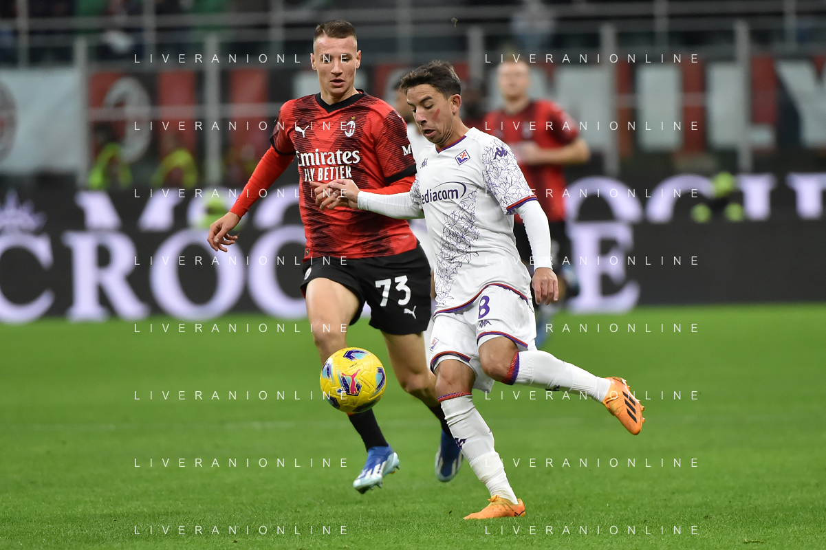 Milan vs Fiorentina nella foto Francesco Camarda (Milan) e Maxime Lopez (Fiorentina) Milano 25-11-2023 Stadio Giuseppe Meazza - San Siro Campionato Serie A TIM - 13a giornata foto Roberto Garavaglia/ag. Aldo Liverani sas/AGENZIA ALDO LIVERANI SAS