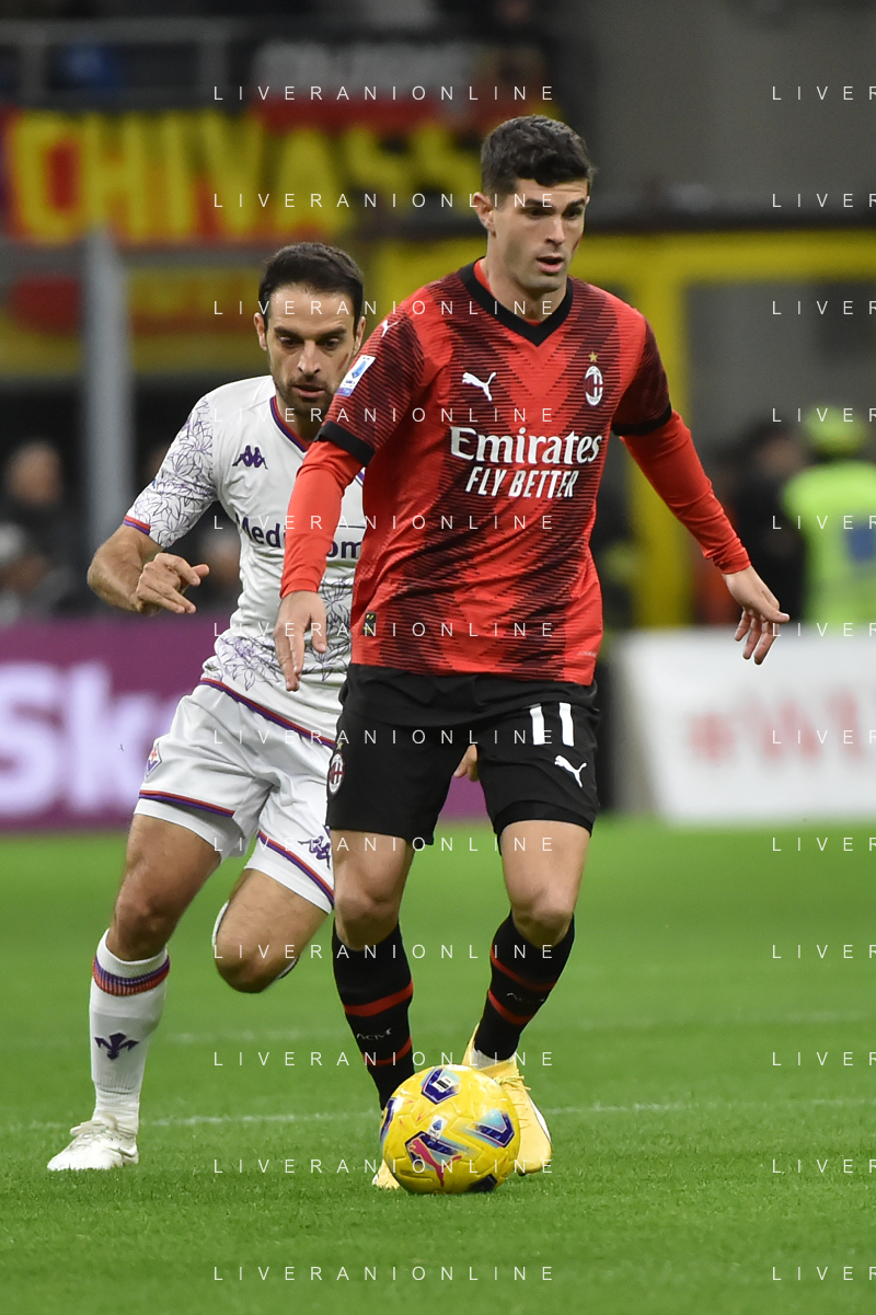 Milan vs Fiorentina nella foto Christian Mate Pulisic (Milan) e dietro Giacomo Bonaventura (Fiorentina) Milano 25-11-2023 Stadio Giuseppe Meazza - San Siro Campionato Serie A TIM - 13a giornata foto Roberto Garavaglia/ag. Aldo Liverani sas/AGENZIA ALDO LIVERANI SAS