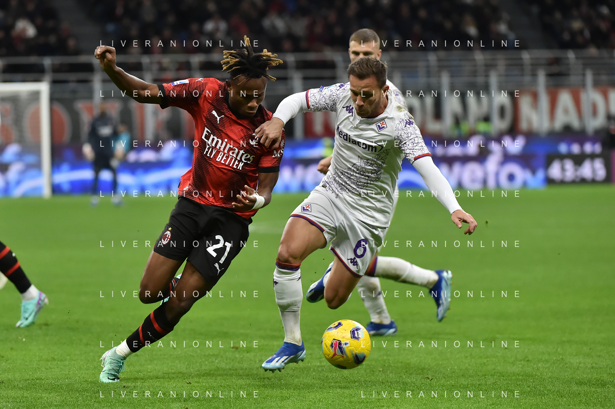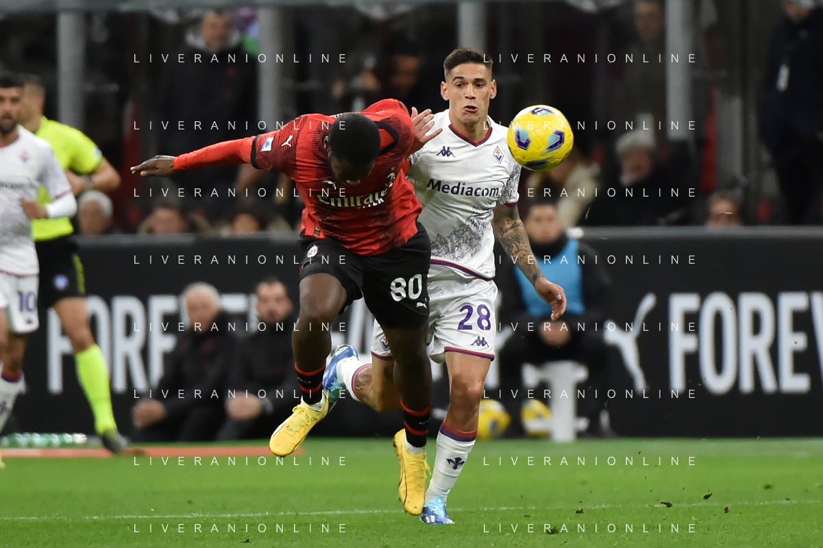 Milan vs Fiorentina nella foto Samuel Chukwueze (Milan) e Arthur Melo (Fiorentina) Milano 25-11-2023 Stadio Giuseppe Meazza - San Siro Campionato Serie A TIM - 13a giornata foto Roberto Garavaglia/ag. Aldo Liverani sas/AGENZIA ALDO LIVERANI SAS