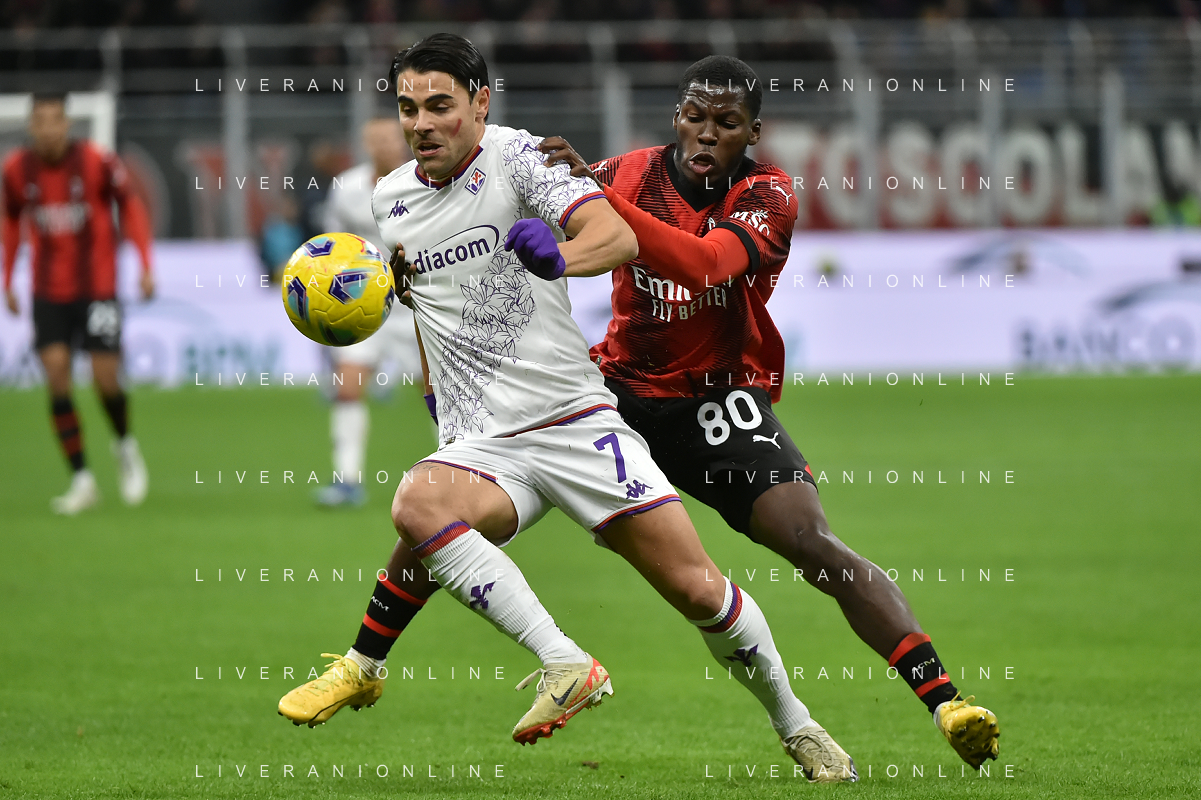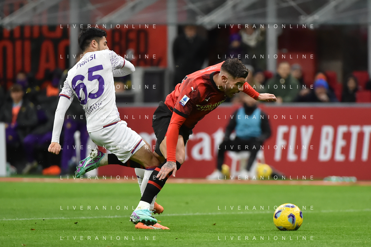 Milan vs Fiorentina nella foto Arthur Melo (Fiorentina) e Tommaso Pobega (Milan) Milano 25-11-2023 Stadio Giuseppe Meazza - San Siro Campionato Serie A TIM - 13a giornata foto Roberto Garavaglia/ag. Aldo Liverani sas/AGENZIA ALDO LIVERANI SAS