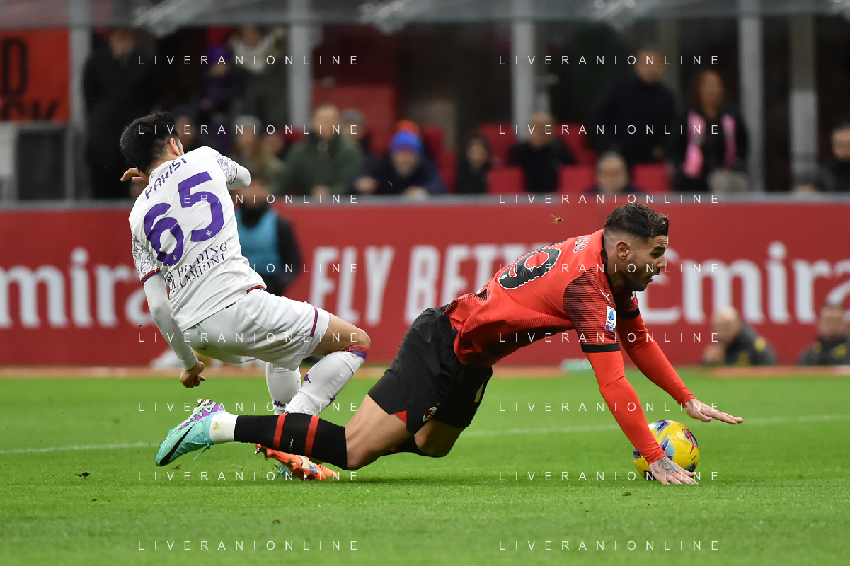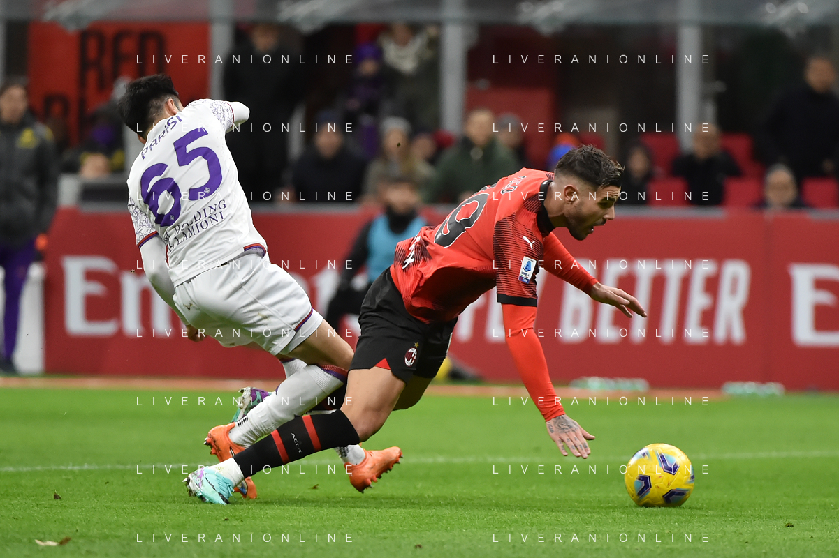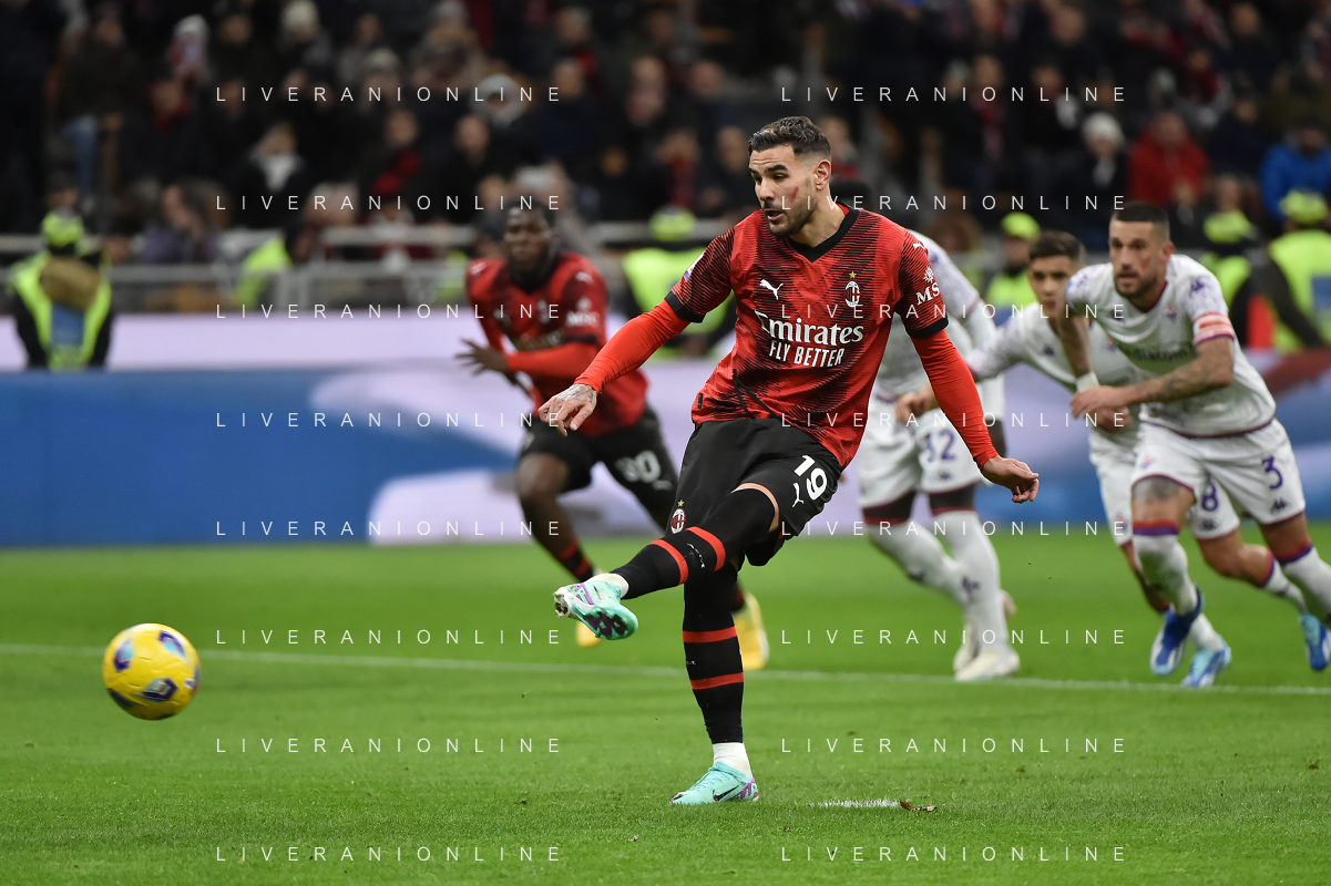 Milan vs Fiorentina nella foto Fabiano Parisi (Fiorentina) atterra in area Theo Hernandez (Milan) e l'arbitro Marco Di Bello di Brindisi concede il rigore Milano 25-11-2023 Stadio Giuseppe Meazza - San Siro Campionato Serie A TIM - 13a giornata foto Roberto Garavaglia/ag. Aldo Liverani sas/AGENZIA ALDO LIVERANI SAS