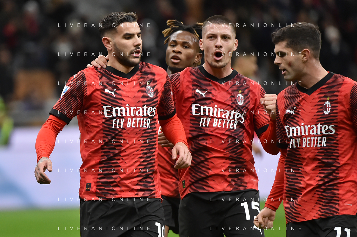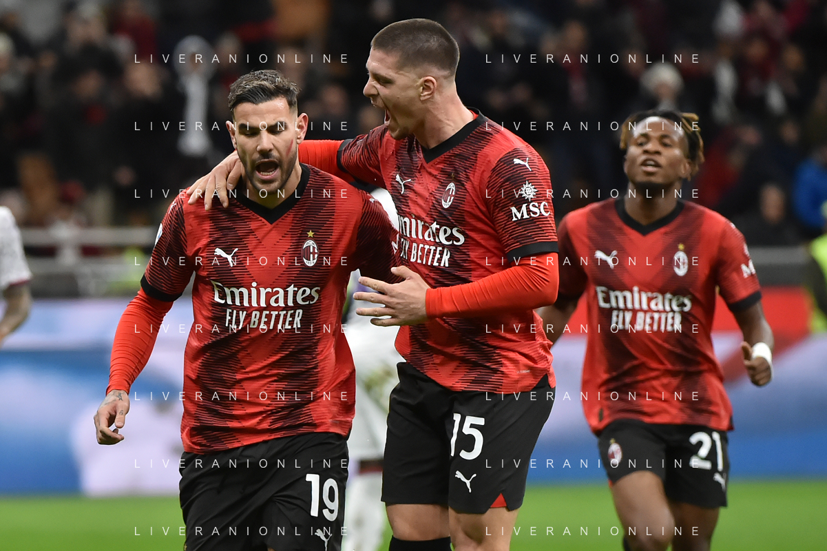 Milan vs Fiorentina nella foto Theo Hernandez (Milan) e Luka Jovic (Milan) esultano dopo il gol dell'1 a 0 Milano 25-11-2023 Stadio Giuseppe Meazza - San Siro Campionato Serie A TIM - 13a giornata foto Roberto Garavaglia/ag. Aldo Liverani sas/AGENZIA ALDO LIVERANI SAS
