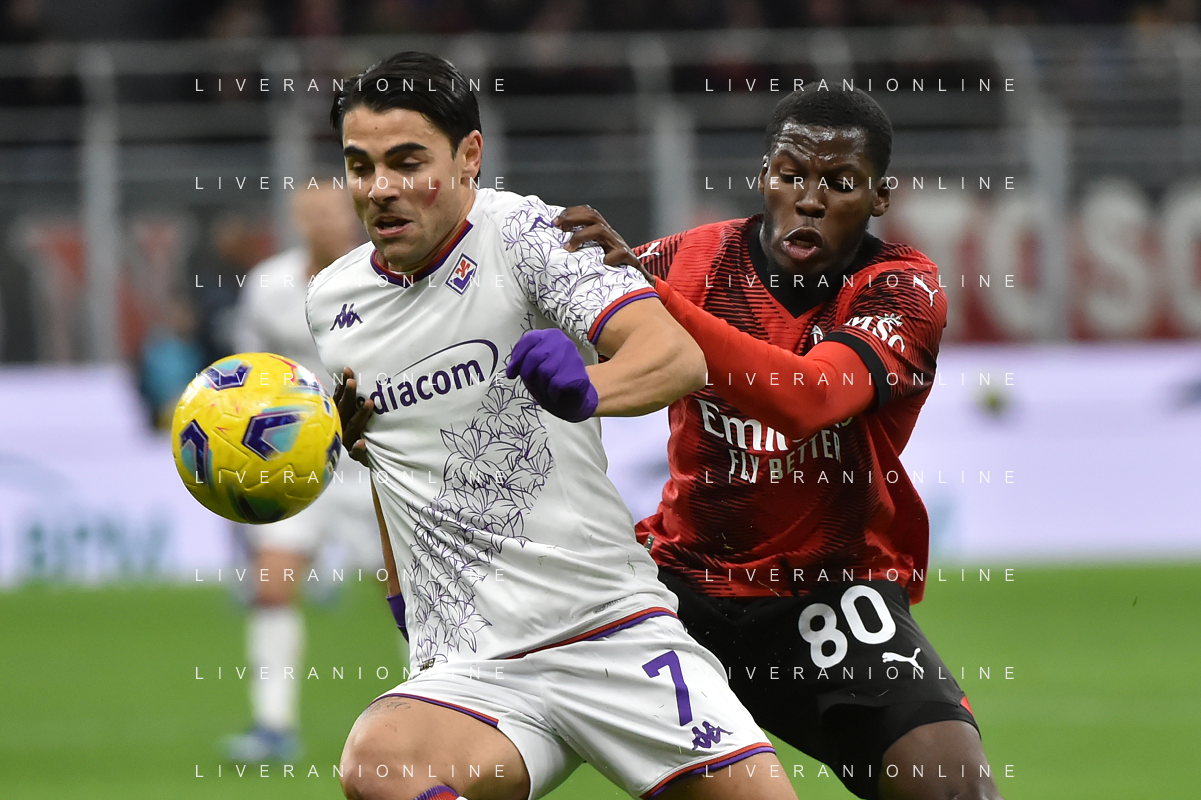 Milan vs Fiorentina nella foto Riccardo Sottil (Fiorentina) e Yunus Musah (Milan) Milano 25-11-2023 Stadio Giuseppe Meazza - San Siro Campionato Serie A TIM - 13a giornata foto Roberto Garavaglia/ag. Aldo Liverani sas/AGENZIA ALDO LIVERANI SAS