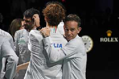 Italia-Australia 26 Novembre 2023 Palacio de Deportes José María Martín Carpena, Malaga Spagna Nella foto: Jannik Sinner e Volandri ©Andrea Rosito/AGENZIA ALDO LIVERANI SAS