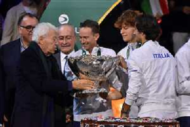Italia-Australia 26 Novembre 2023 Palacio de Deportes José María Martín Carpena, Malaga Spagna Nella foto: Nicola Pietrangeli consegna la Coppa Davis a Jannik Sinner ©Andrea Rosito/AGENZIA ALDO LIVERANI SAS