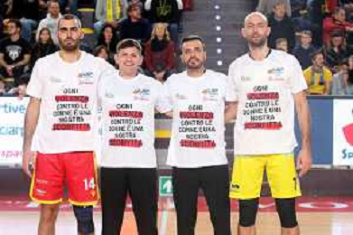 IMOLA 26 11 2023 VIRTUS IMOLA-ORASI RAVENNA SERIE B1 NELLA FOTO FRANCESCO BEDETTI CAPITANO DEL RAVENNA E JACOPO AGLIO CAPITANO VIRTUS IMOLA CON GLI ARBITRI CON LA MAGLIA CONTRO LA VIOLENZA SULLE DONNE ©SANNA/AGENZIA ALDO LIVERANI SAS