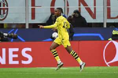 Milan vs Borussia Dortmund nella foto Jamie Bynoe-Gittens (Borussia Dortmund) esulta dopo il gol del 2 a 1 Milano 28-11-2023 Stadio Giuseppe Meazza - San Siro UEFA Champions League fase a gironi 5a giornata - Gruppo F foto Roberto Garavaglia/ag. Aldo Liverani sas/AGENZIA ALDO LIVERANI SAS