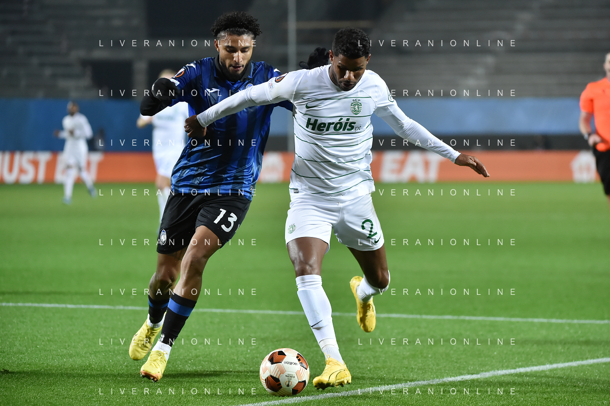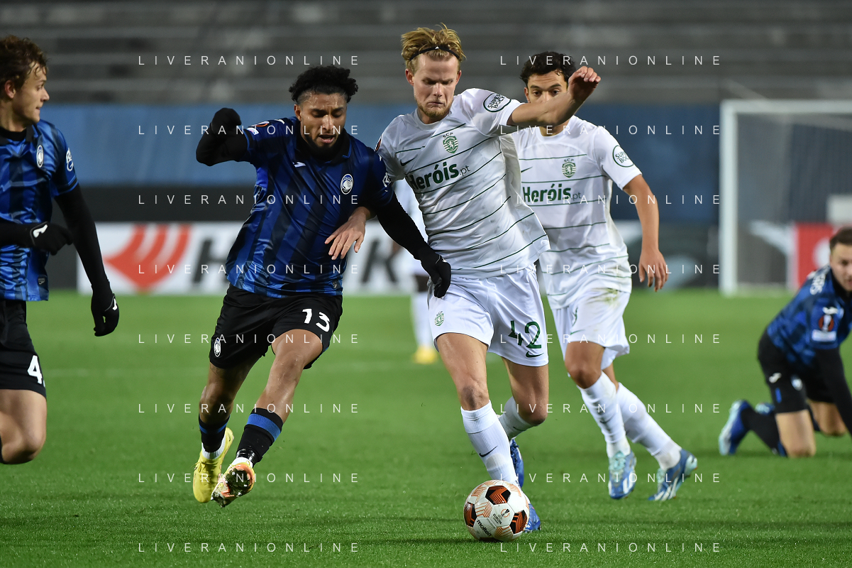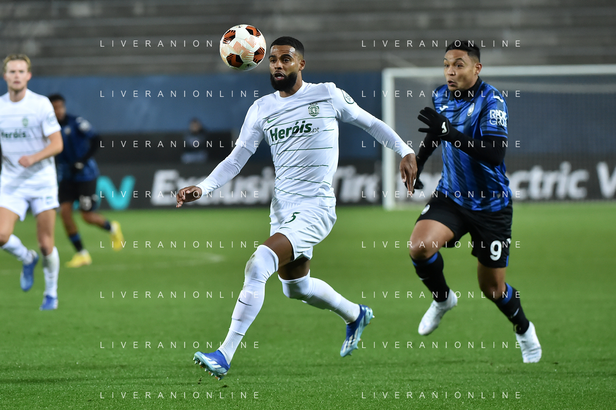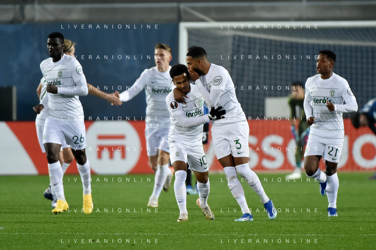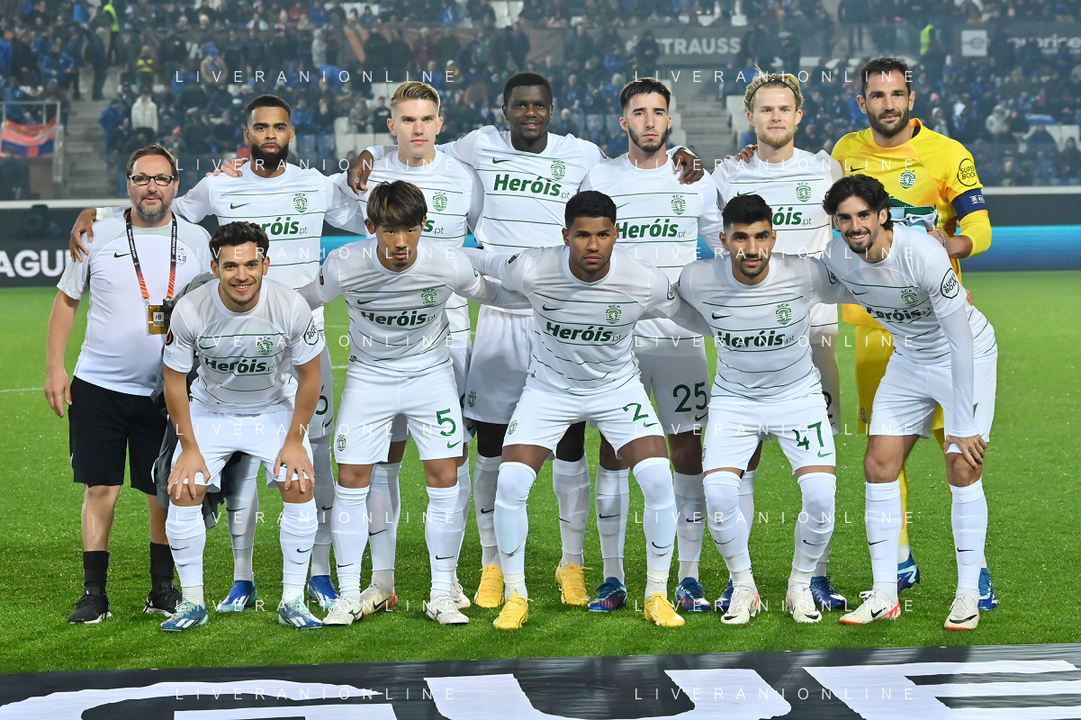 TVRG Atalanta vs Sporting Lisbona nella foto formazione Sporting Lisbona, in piedi da SX un magazziniere, Jeremiah Israel St. Juste, Viktor Elnar Gyokeres, Ousmane Diomande, Goncalo Bernardo Inacio, Morten Hjulmand e Antonio Adan Garrido; in basso da SX Pedro Antonio Goncalves, Hidemasa Morita, Matheus Reis de Lima, Ricardo de Sousa Esgaio e Francisco Antonio Trincao Bergamo 30-11-2023 Gewiss Stadium - Stadio Atleti Azzurri d'Italia UEFA Europa League - fase a gironi Gruppo D - 5a giornata foto Roberto Garavaglia/ag. Aldo Liverani sas