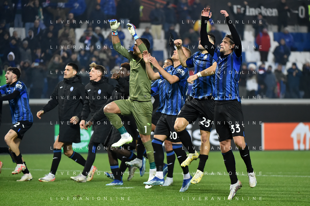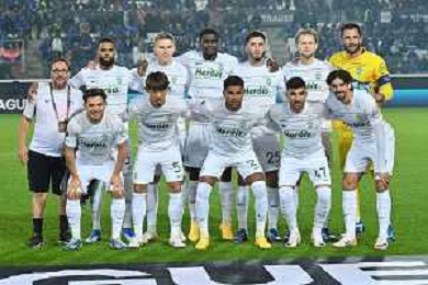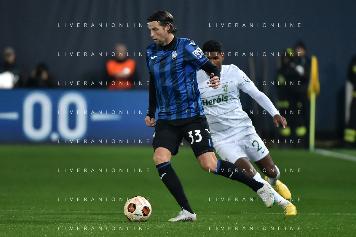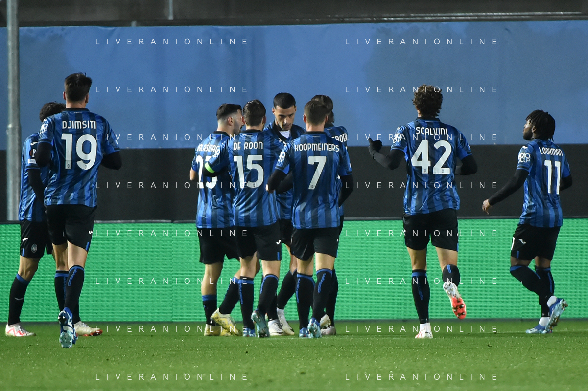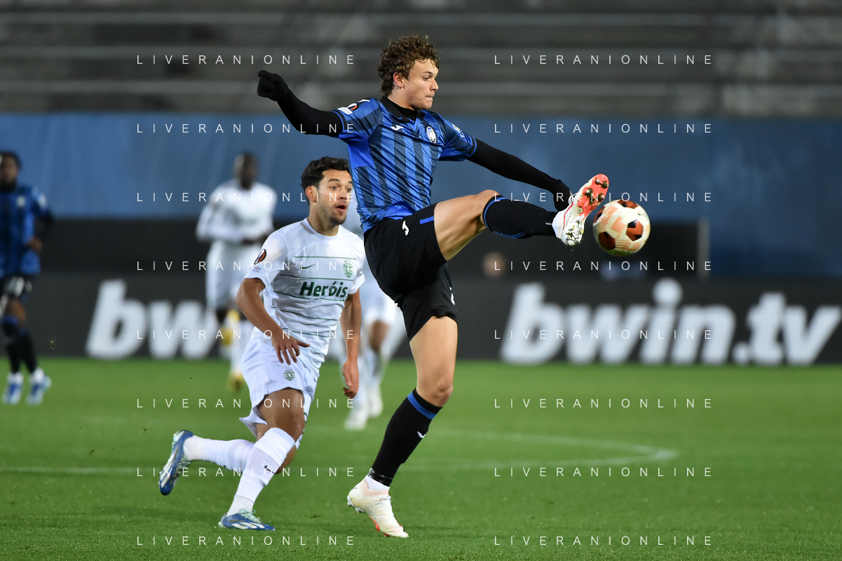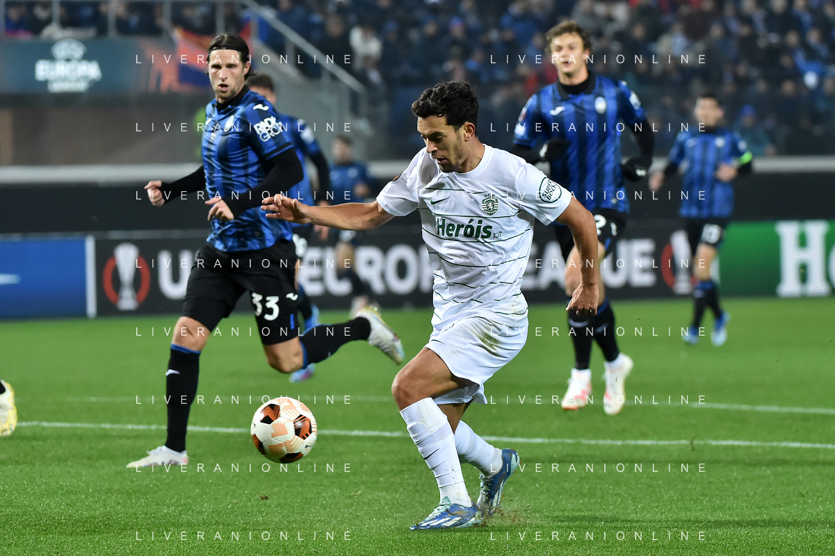 TVRG Atalanta vs Sporting Lisbona nella foto formazione Sporting Lisbona, in piedi da SX un magazziniere, Jeremiah Israel St. Juste, Viktor Elnar Gyokeres, Ousmane Diomande, Goncalo Bernardo Inacio, Morten Hjulmand e Antonio Adan Garrido; in basso da SX Pedro Antonio Goncalves, Hidemasa Morita, Matheus Reis de Lima, Ricardo de Sousa Esgaio e Francisco Antonio Trincao Bergamo 30-11-2023 Gewiss Stadium - Stadio Atleti Azzurri d'Italia UEFA Europa League - fase a gironi Gruppo D - 5a giornata foto Roberto Garavaglia/ag. Aldo Liverani sas
