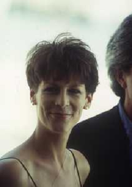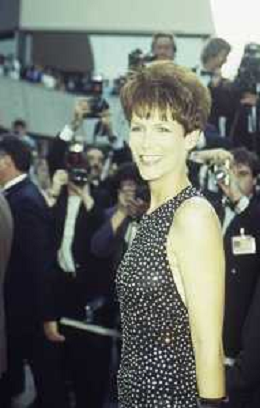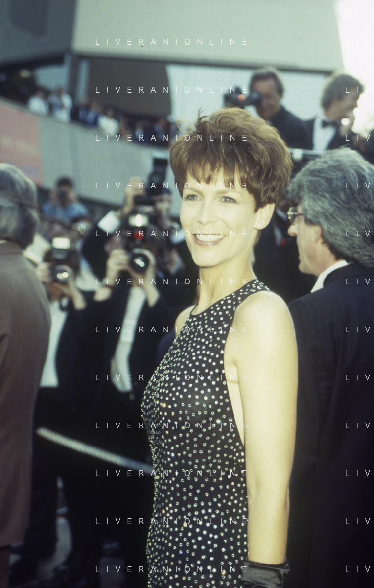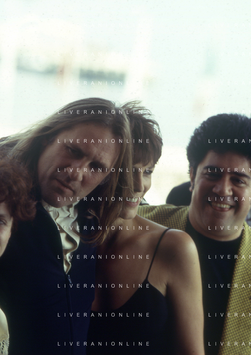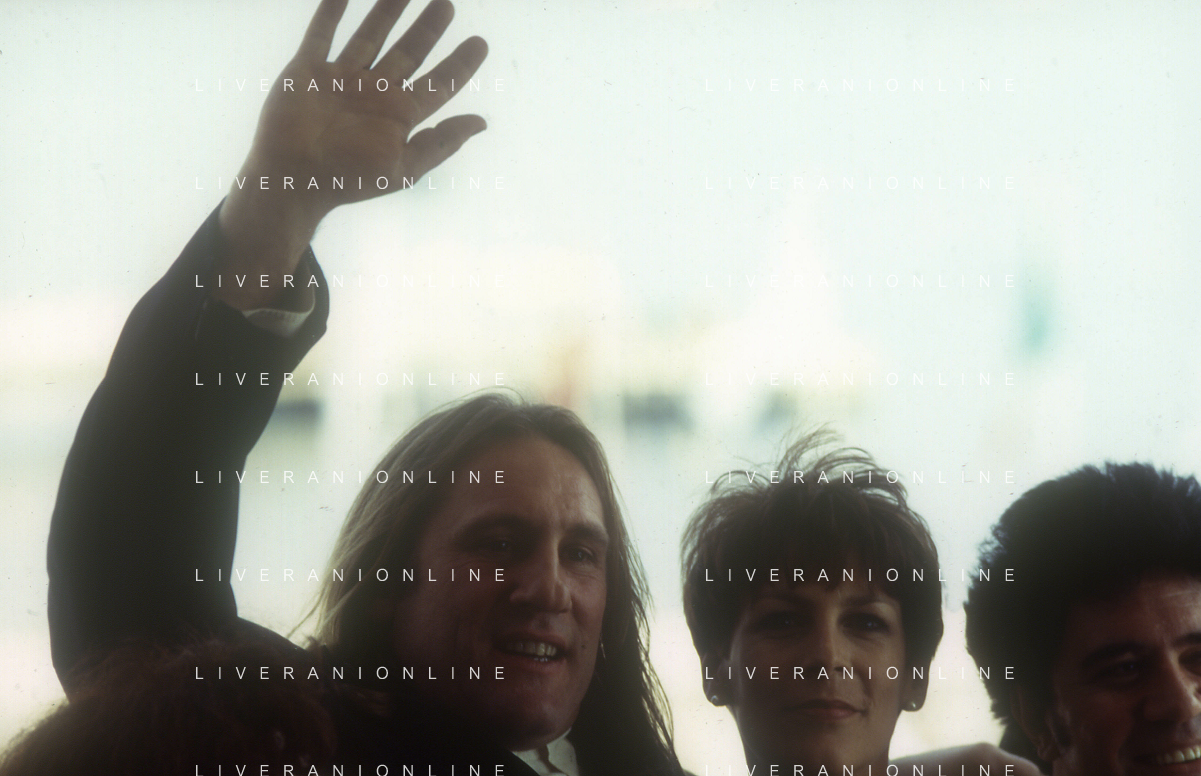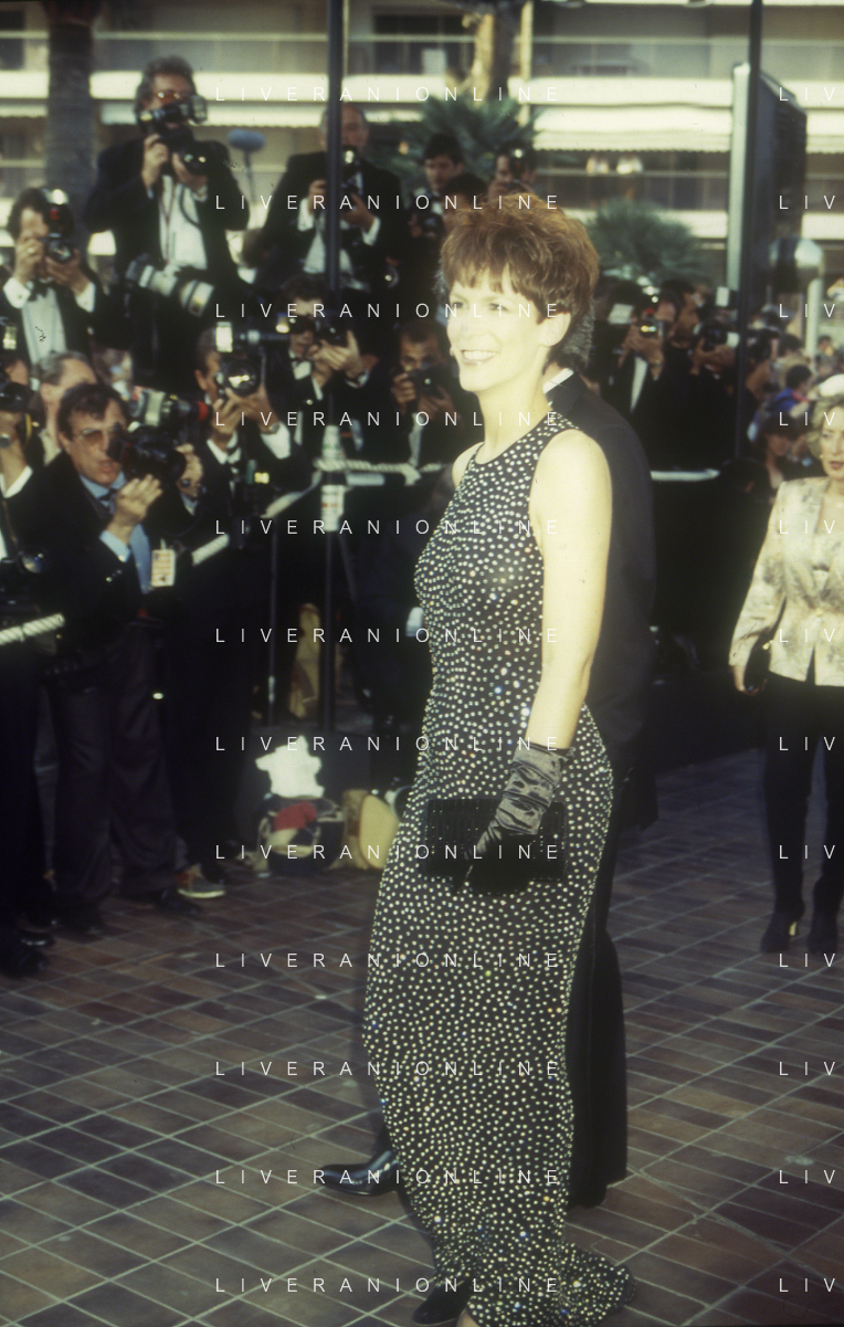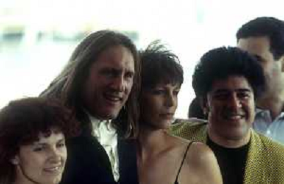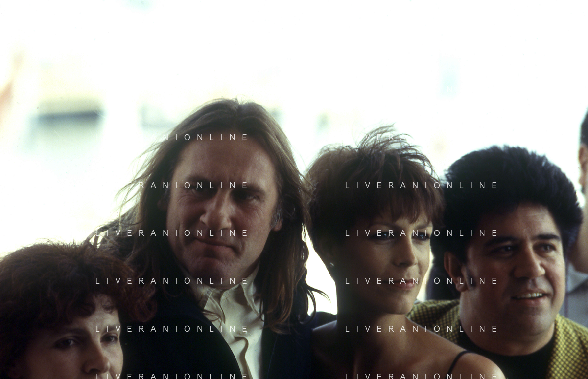 DIAP-RETROSPETTIVA JAMIE LEE CURTIS ATTRICE NELLA FOTO JAMIE LEE CURTIS NELL'ANNO 1992 A CANNES CON GERARD DEPARDIEU E PEDRO ALMODOVAR AG ALDO LIVERANI SAS
