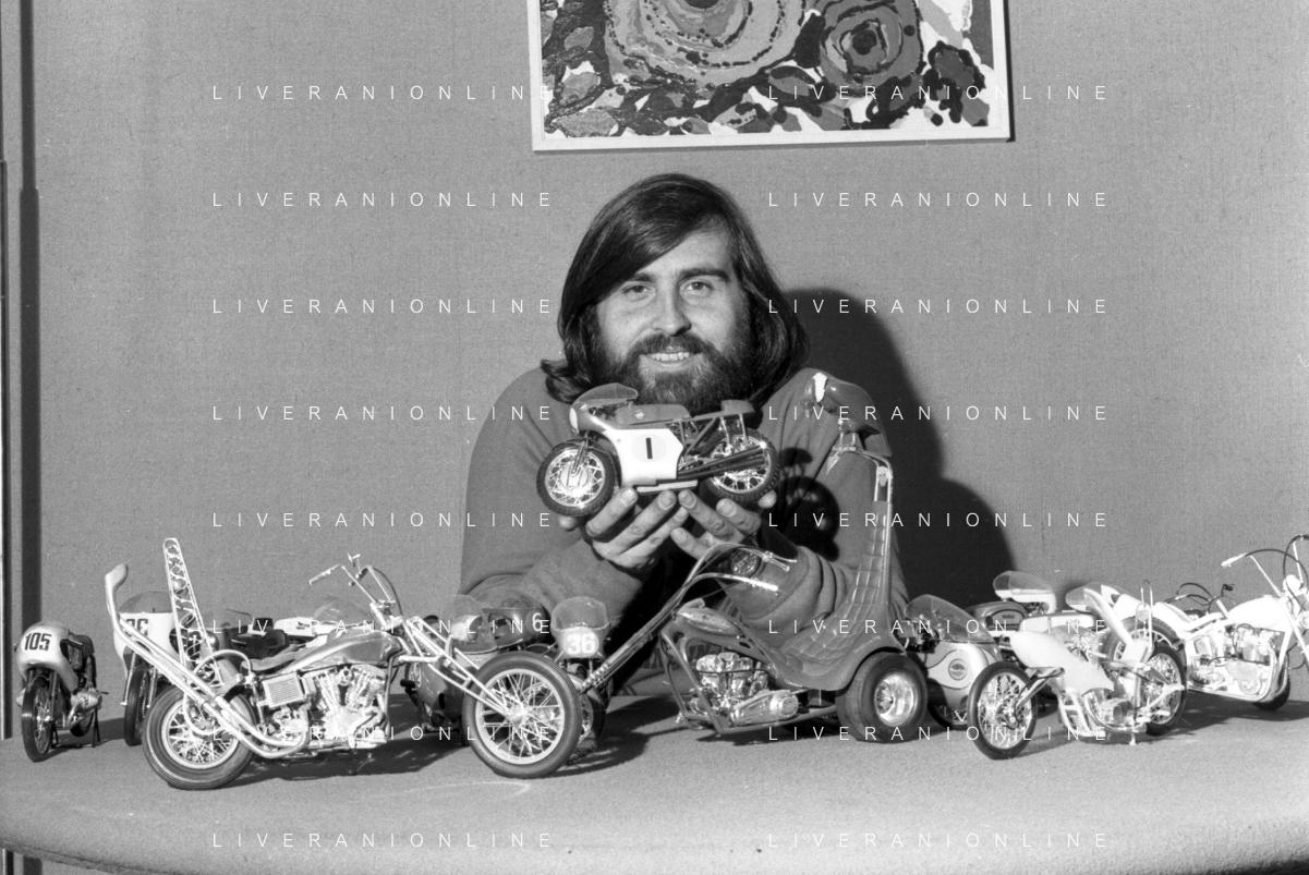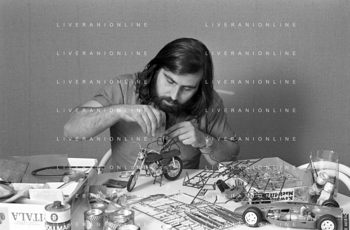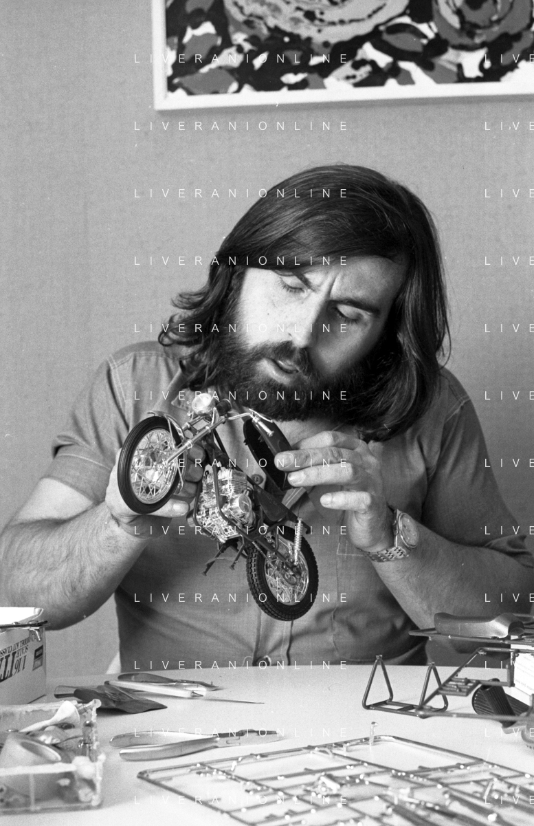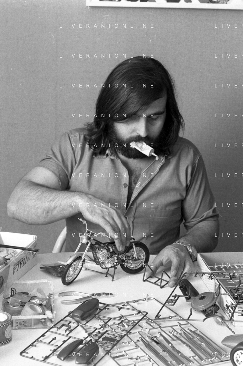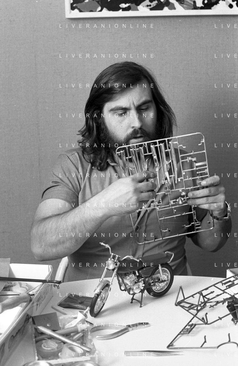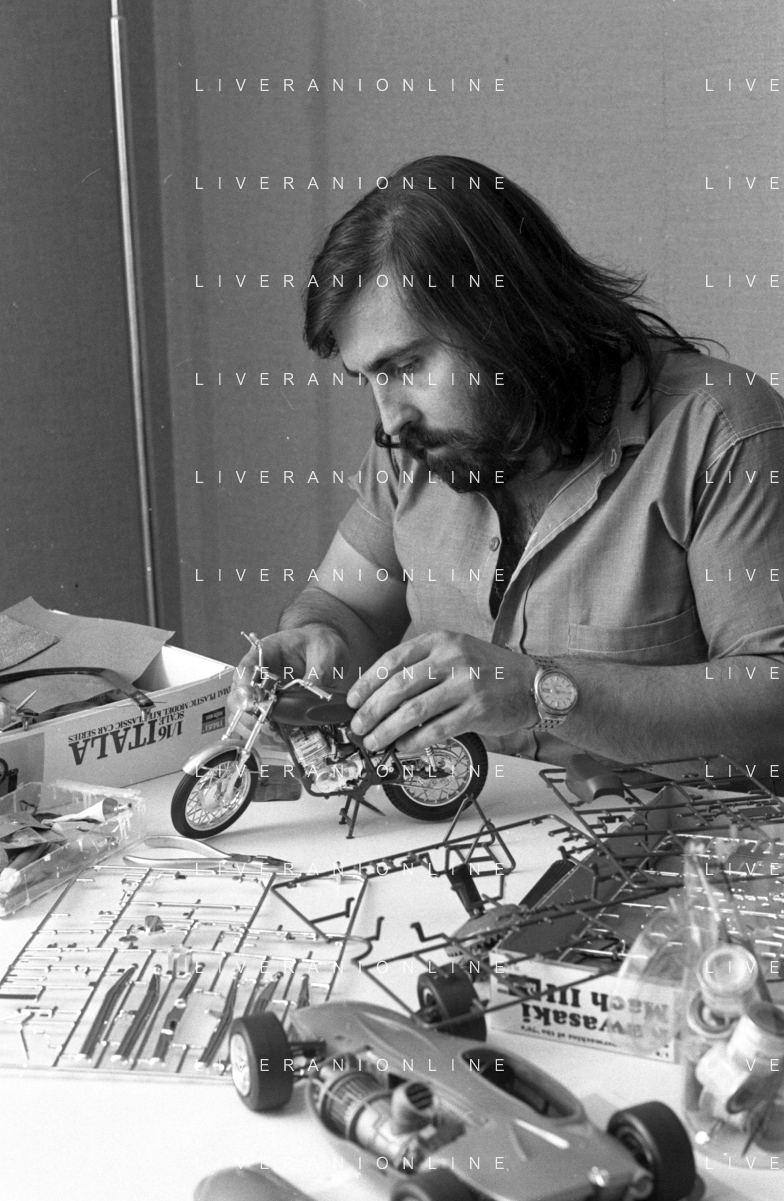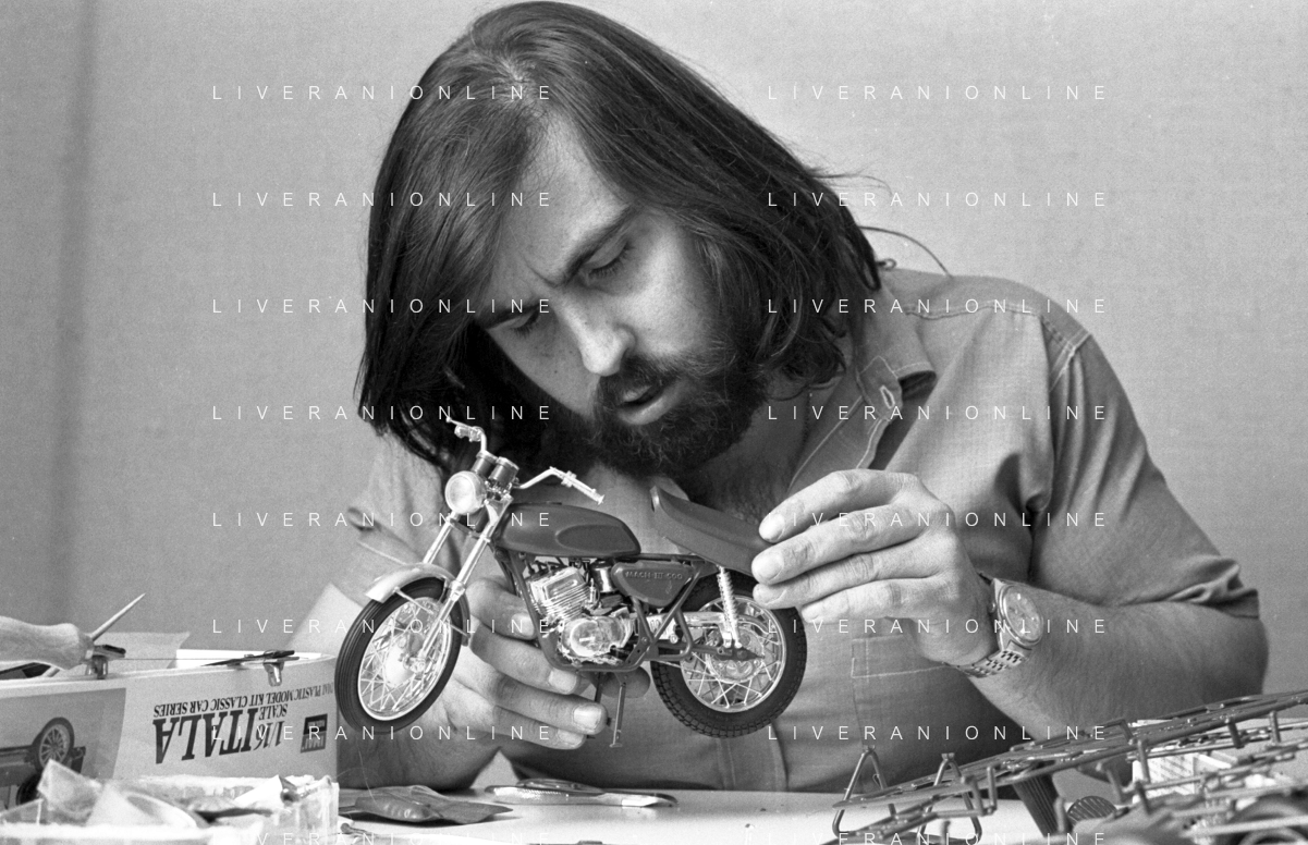 Neg- RETROSPETTIVA GRUPPO MUSICALE "I CAMALEONTI" NEL 1972 NELLA FOTO PAOLO DE CEGLIE (Batteria) NEL SUO MESTIERE DI "COLLEZIONISTA DI MODELLINI DI MOTO - MODELLISMO" AG. ALDO LIVERANI SAS