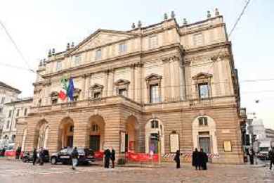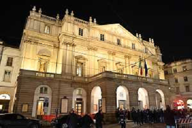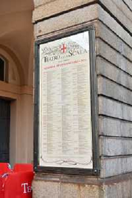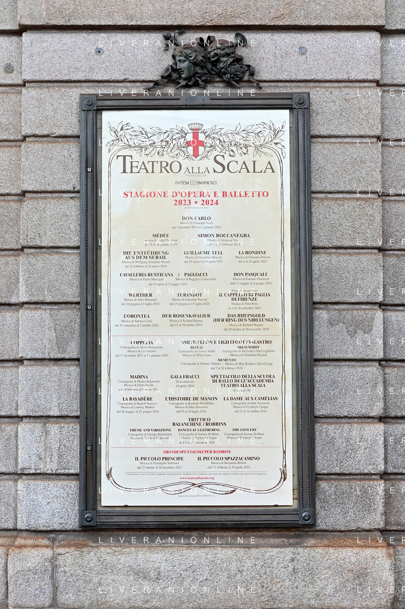 TVRG Prima alla Scala nella foto cartellone spettacoli Teatro alla Scala Milano 07-12-2023 Arrivo delle personalita' per assistere alla prima del Teatro alla Scala foto Roberto Garavaglia/ag. Aldo Liverani sas