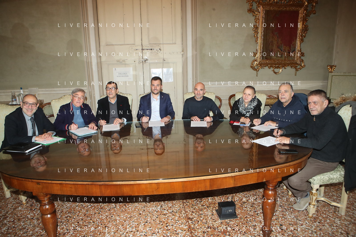 IMOLA 14 12 2023 Giunta Comunale e CGIL - CISL - UIL territoriali e SPI CGIL FNP CISL UILP UIL UN FONDO DI 350 MILA EURO PER TUTTI I BISOGNI SOCIALI E DELLE FAMIGLIE. RINVIATO L ADEGUAMENTO ISTAT PER I SERVIZI DI MENSA E TRASPORTO SCOLASTICO FINO A DOPO L APPROVAZIONE DELLA FINANZIARIA NELLA FOTO SINDACO MARCO PANIERI,VICE SINDACO FABRIZIO CASTELLARI,STEFANO MONI CGIL,GIUSEPPE RAGO UIL E ENRICO BASSANI CISL FOTO GIANNI SANNA-AG ALDO LIVERANI SAS
