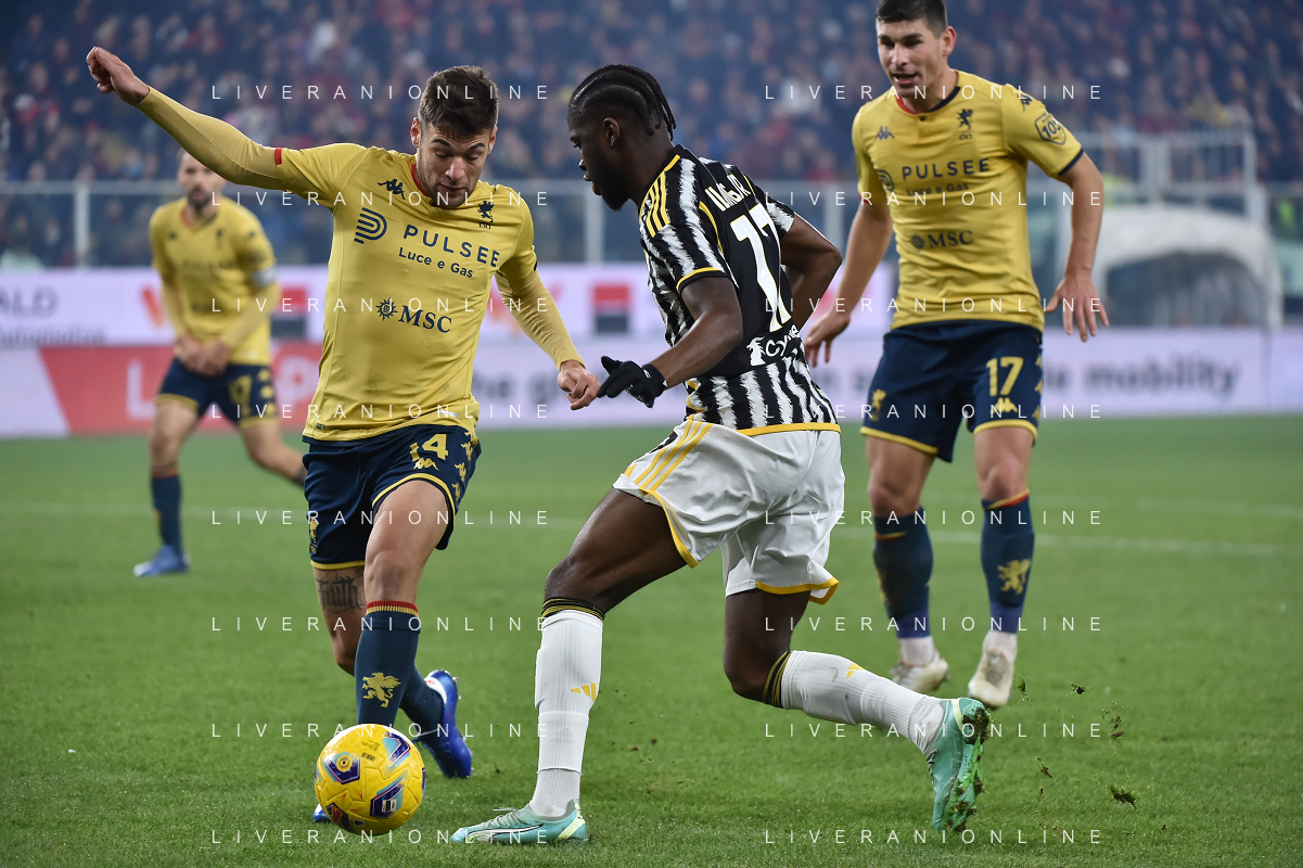 Genoa vs Juventus nella foto Alessandro Vogliacco (Genoa) e Samuel Iling-Junior (Juventus) Genova 15-12-2023 Stadio Luigi Ferraris - Marassi Campionato Serie A TIM - 16a giornata foto Roberto Garavaglia/ag. Aldo Liverani sas / AGENZIA ALDO LIVERANI SAS