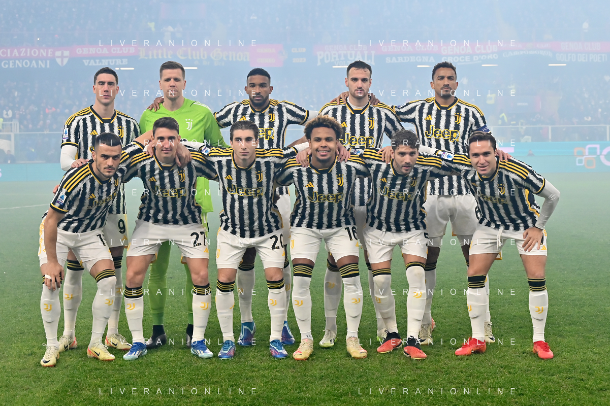Genoa vs Juventus nella foto formazione Juventus, in piedi da SX Dusan Vlahovic, Wojciech Szczesny, Gleison Bremer, Federico Gatti e Danilo Luiz Da Silva; in basso da SX Filip Kostic, Andrea Cambiaso, Fabio Miretti, Weston McKennie, Manuel Locatelli e Federico Chiesa Genova 15-12-2023 Stadio Luigi Ferraris - Marassi Campionato Serie A TIM - 16a giornata foto Roberto Garavaglia/ag. Aldo Liverani sas