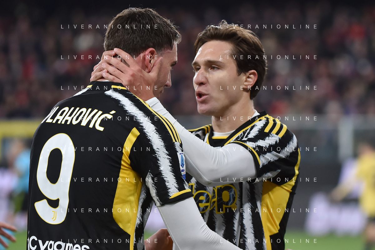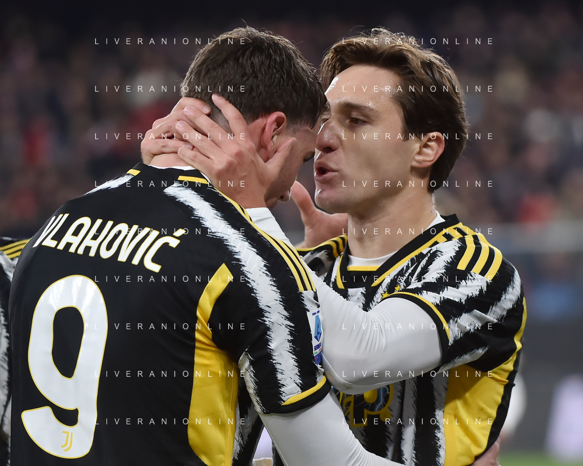 Genoa vs Juventus nella foto Dusan Vlahovic (Juventus) SX e Federico Chiesa (Juventus) DX esultano dopo il gol dell'1 a 0 Genova 15-12-2023 Stadio Luigi Ferraris - Marassi Campionato Serie A TIM - 16a giornata foto Roberto Garavaglia/ag. Aldo Liverani sas
