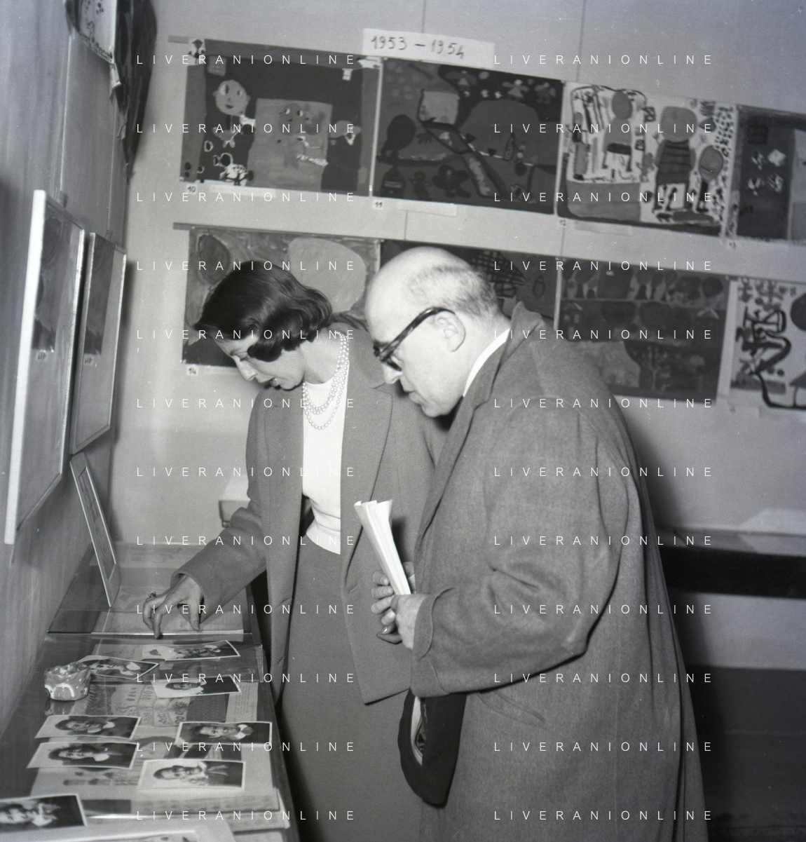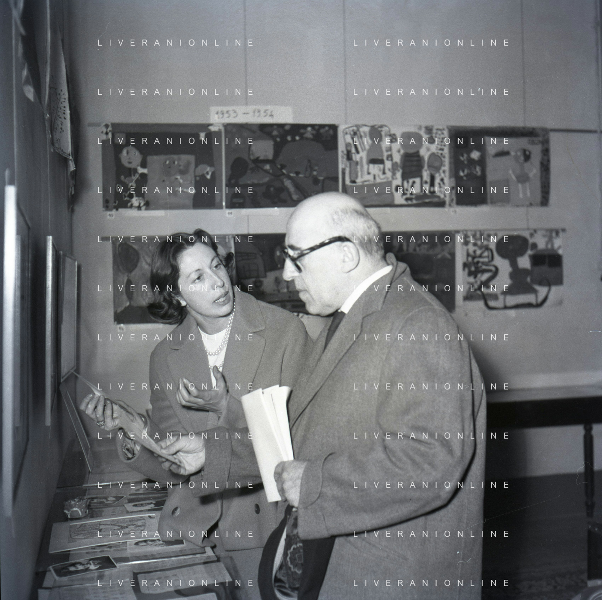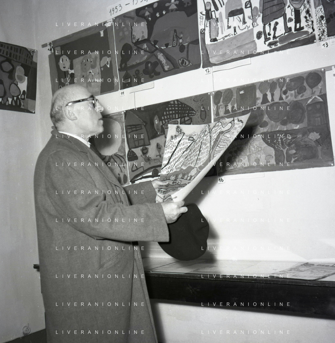 NEG-RETROSPETTIVA CESARE ZAVATTINI SCENEGIATORE-GIORNALISTA- SCRITTORE -POETA E PITTORE ITALIANO NELLA FOTO CESARE ZAVATTINI A ROMA NELL'ANNO 1955 A UNA MOSTRA DEI QUADRI DEI BAMBINI AG ALDO LIVERANI SAS