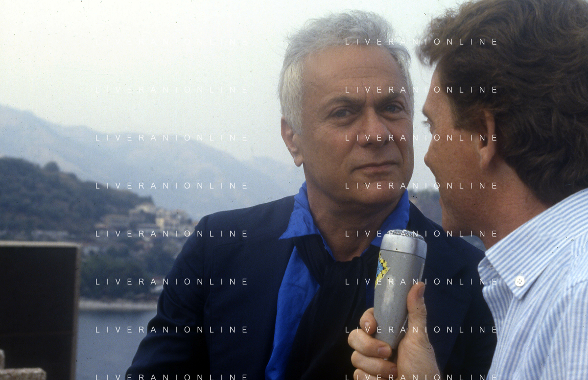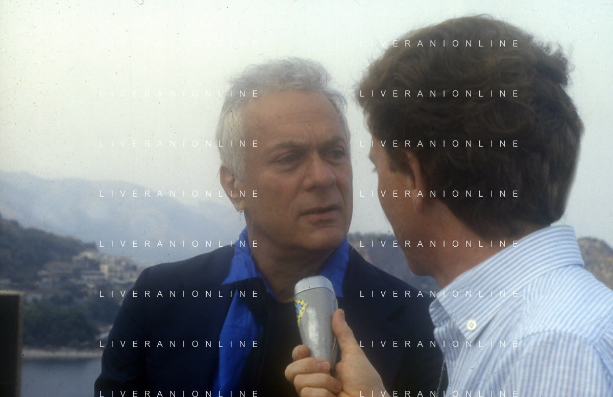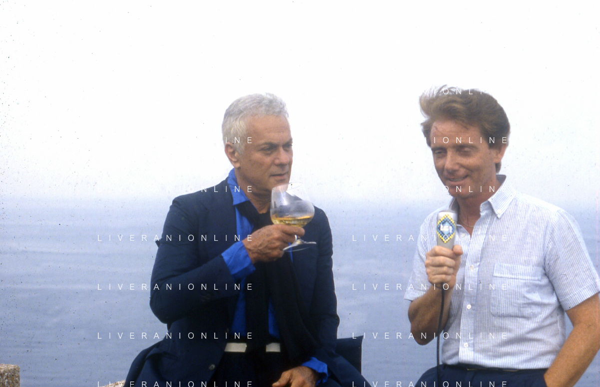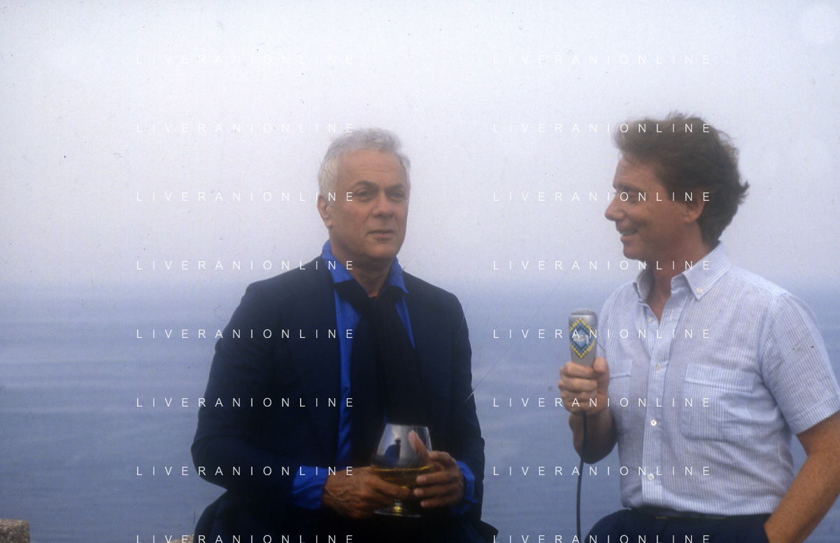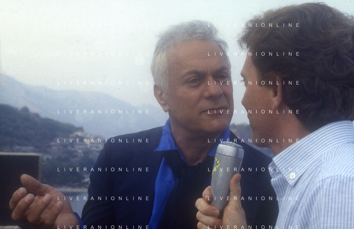 DIAP-RETROSPETTIVA TONY CURTIS ATTORE NELLA FOTO TONY CURTIS CON IL GIORNALISTA OSVALDO BEVILACQUA A TAORMINA NELL'ANNO 1985 AG ALDO LIVERANI SAS
