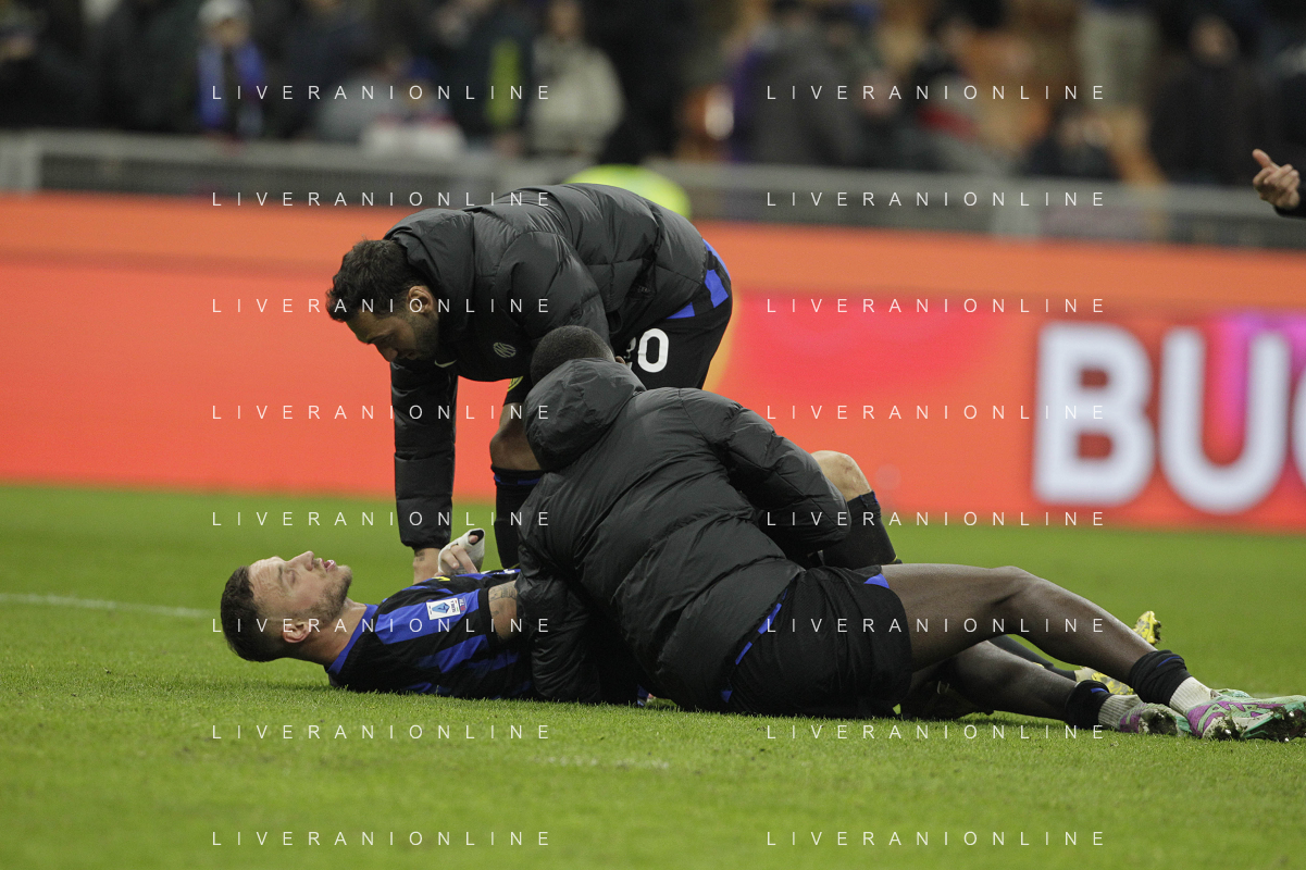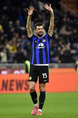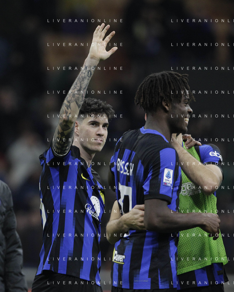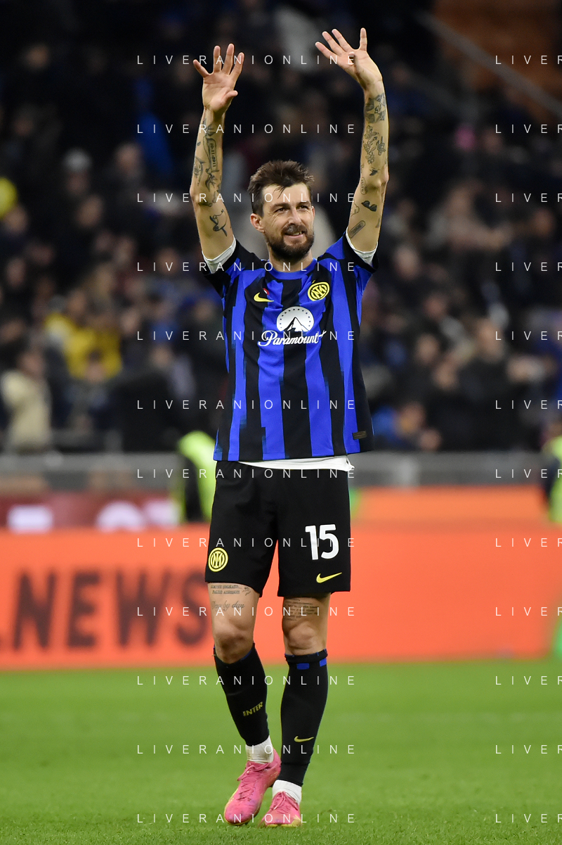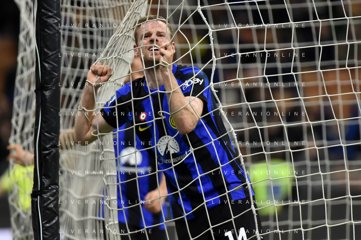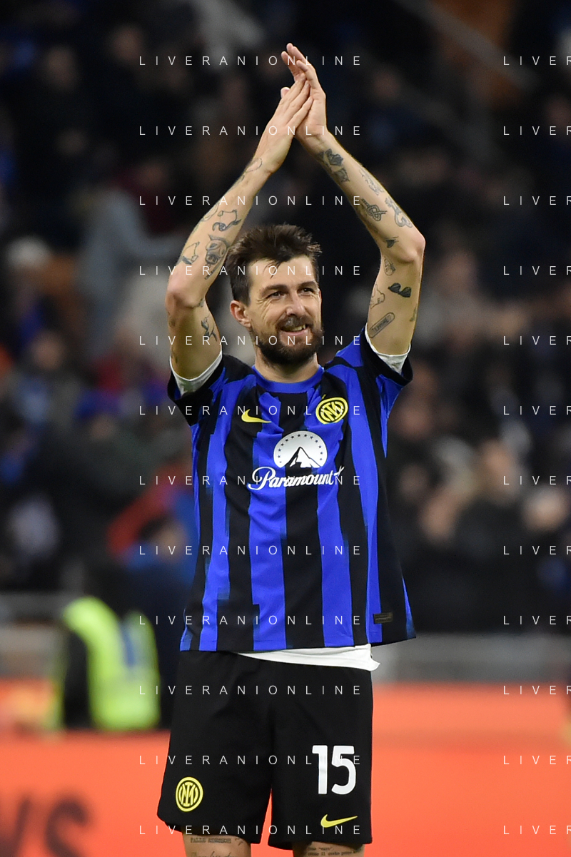 Inter vs Lecce nella foto Francesco Acerbi (Inter) esultanza a fine partita Milano 23-12-2023 Stadio Giuseppe Meazza - San Siro Campionato Serie A TIM - 17a giornata foto Roberto Garavaglia/ag. Aldo Liverani sas