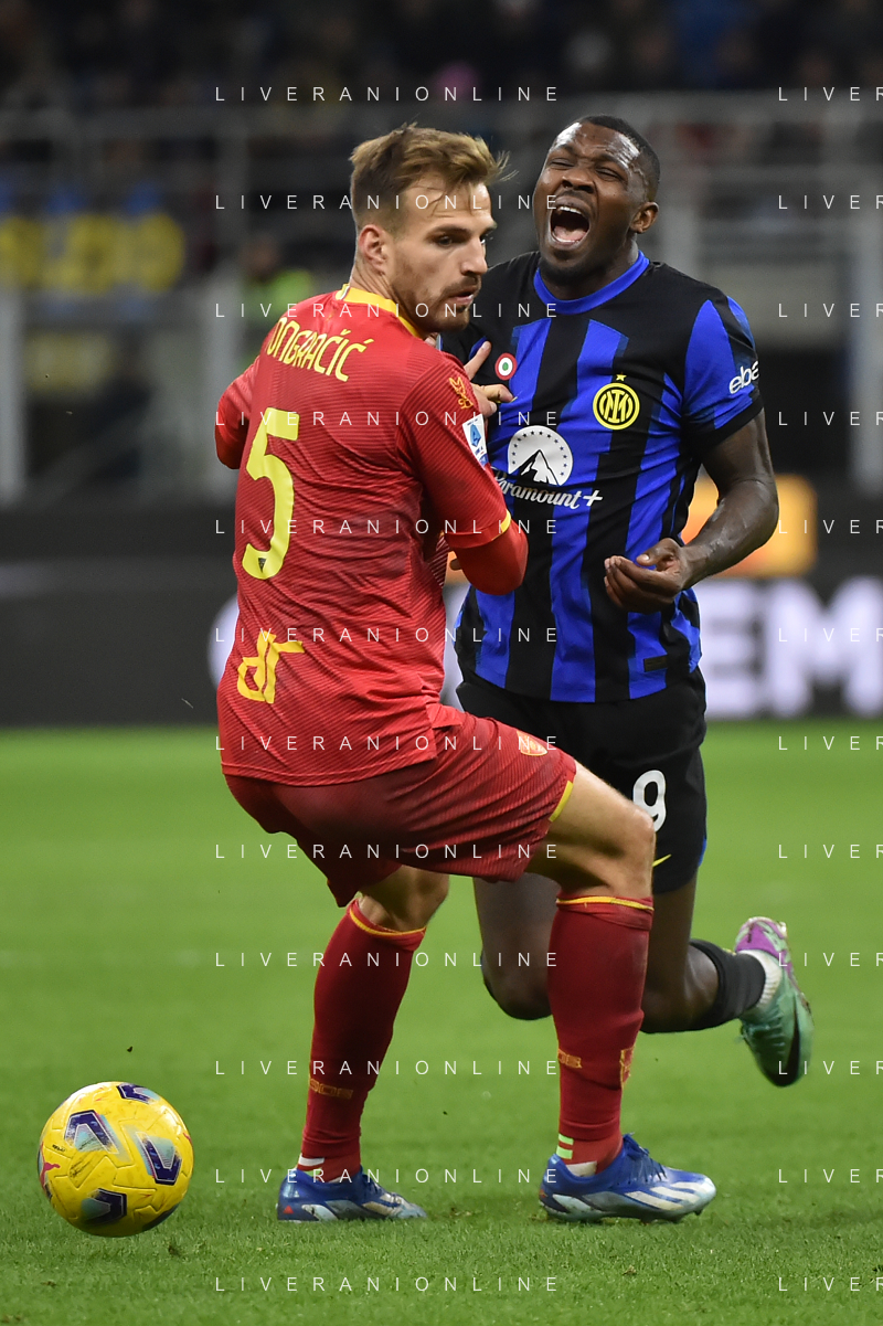 Inter vs Lecce nella foto Marin Pongracic (Lecce) e Marcus Thuram (Inter) Milano 23-12-2023 Stadio Giuseppe Meazza - San Siro Campionato Serie A TIM - 17a giornata foto Roberto Garavaglia/ag. Aldo Liverani sas/AGENZIA ALDO LIVERANI SAS