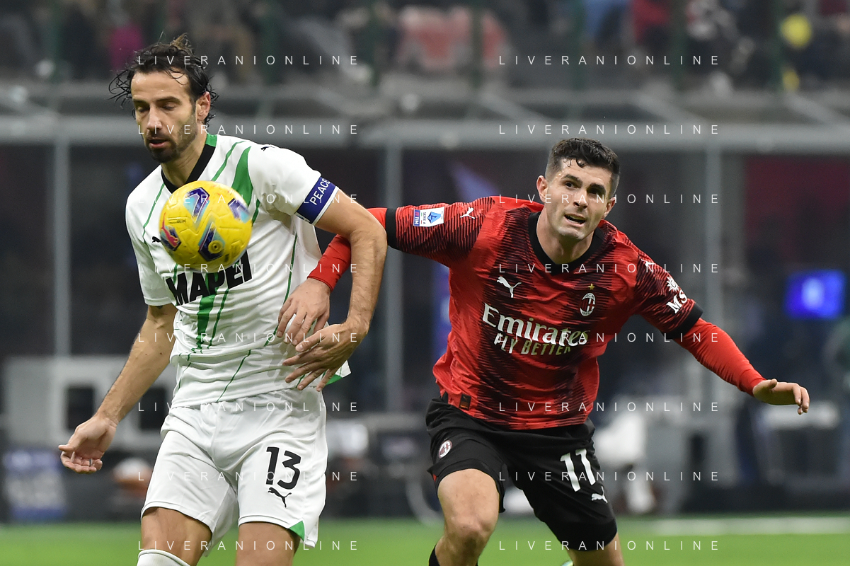 Milan vs Sassuolo nella foto Gian Marco Ferrari (Sassuolo) e Christian Mate Pulisic (Milan) Milano 30-12-2023 Stadio Giuseppe Meazza - San Siro Campionato Serie A TIM - 18a giornata foto Roberto Garavaglia/ag. Aldo Liverani sas/AGENZIA ALDO LIVERANI SAS