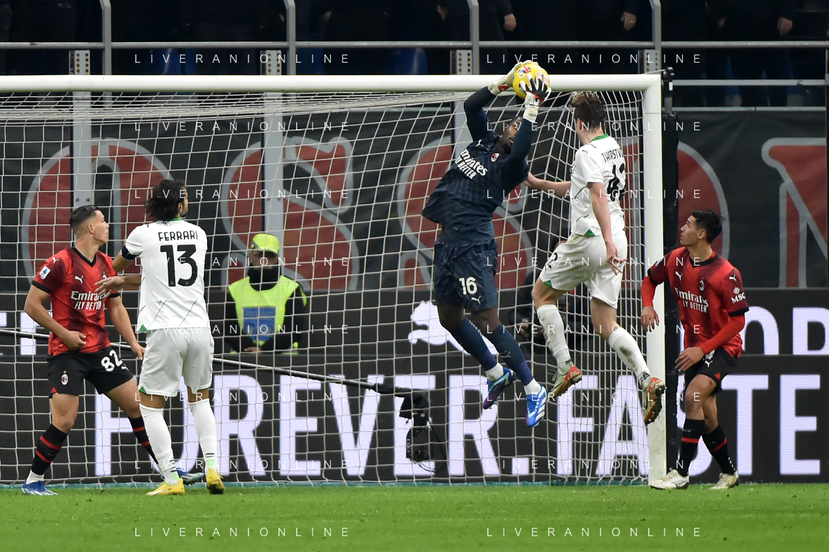 Milan vs Sassuolo nella foto Mike Maignan (Milan) in uscita anticipa Kristian Thorstvedt (Sassuolo) Milano 30-12-2023 Stadio Giuseppe Meazza - San Siro Campionato Serie A TIM - 18a giornata foto Roberto Garavaglia/ag. Aldo Liverani sas