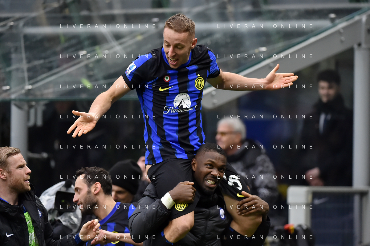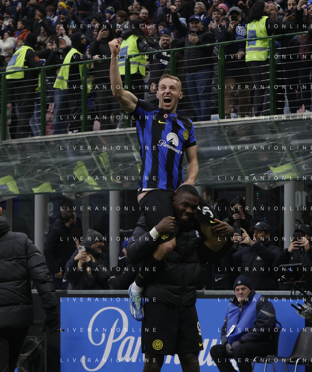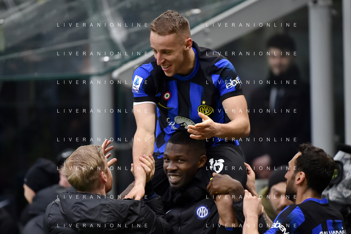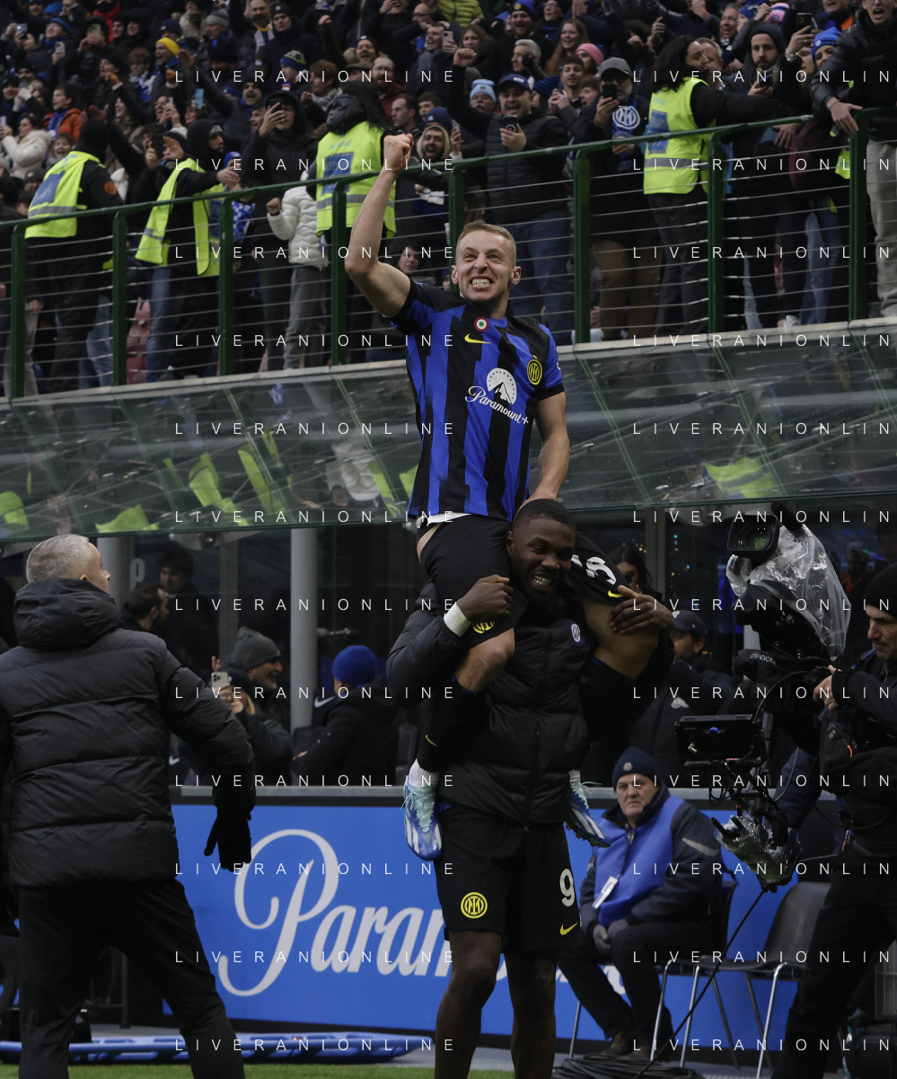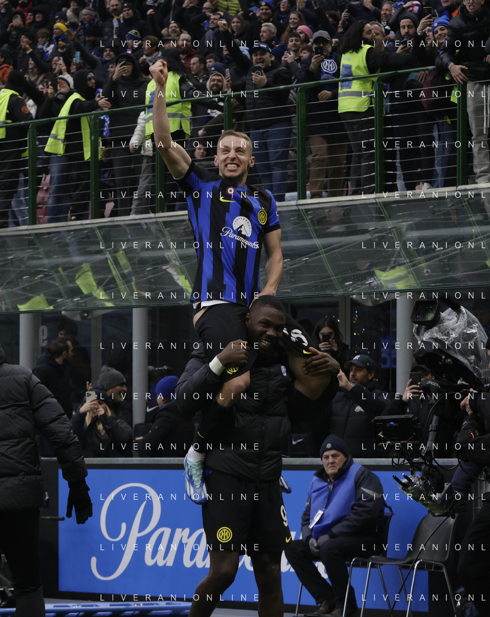 Inter vs Hellas Verona nella foto Davide Frattesi (Inter) esulta dopo il gol del 2 a 1 portato sulle spalle da Marcus Thuram (Inter) Milano 06-01-2024 Stadio Giuseppe Meazza - San Siro Campionato Serie A TIM - 19a giornata foto Roberto Garavaglia/Agenzia Aldo Liverani sas