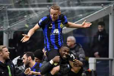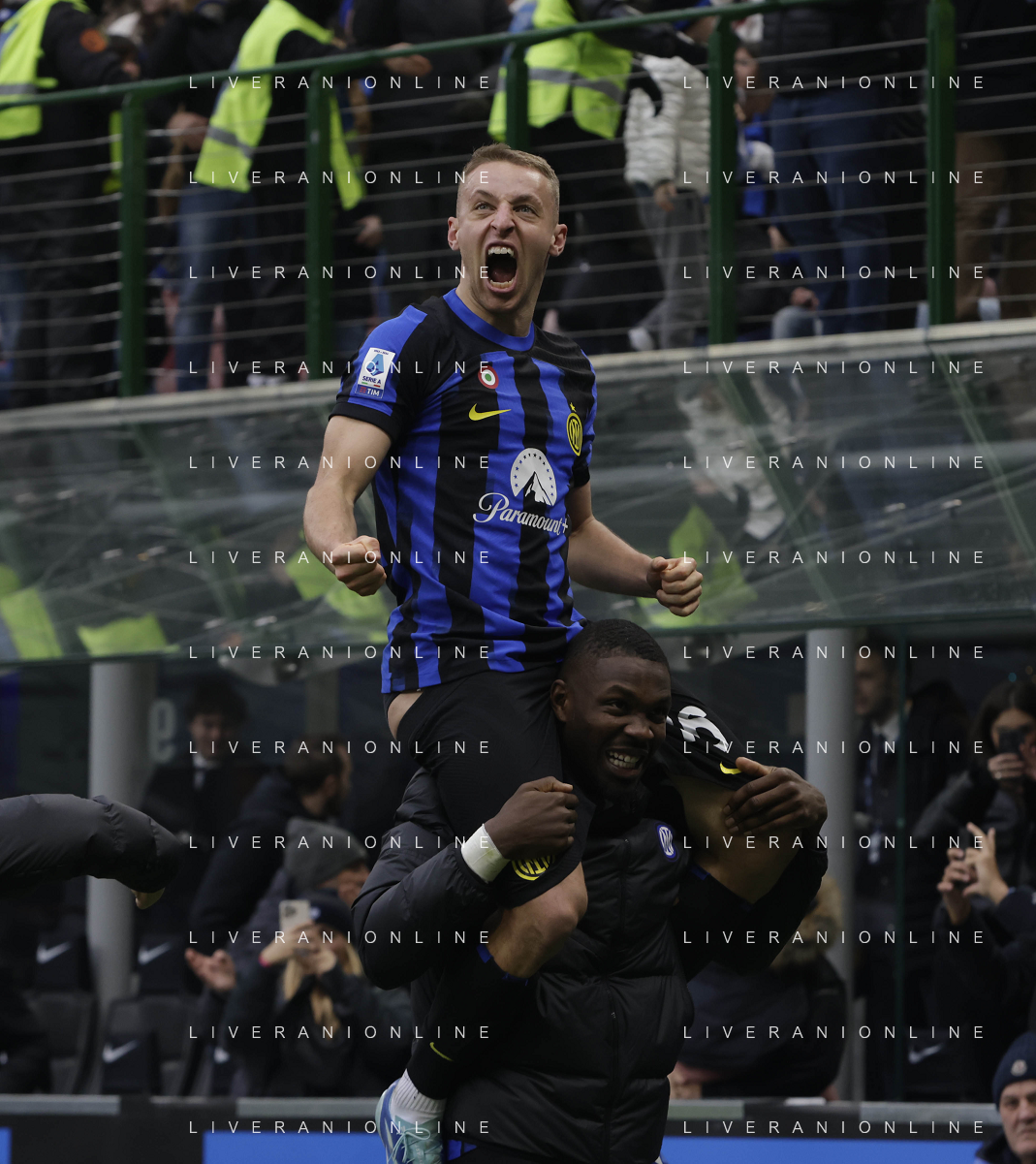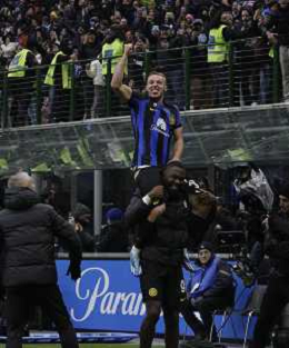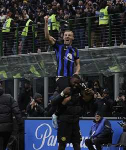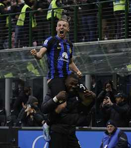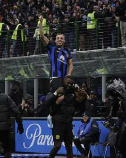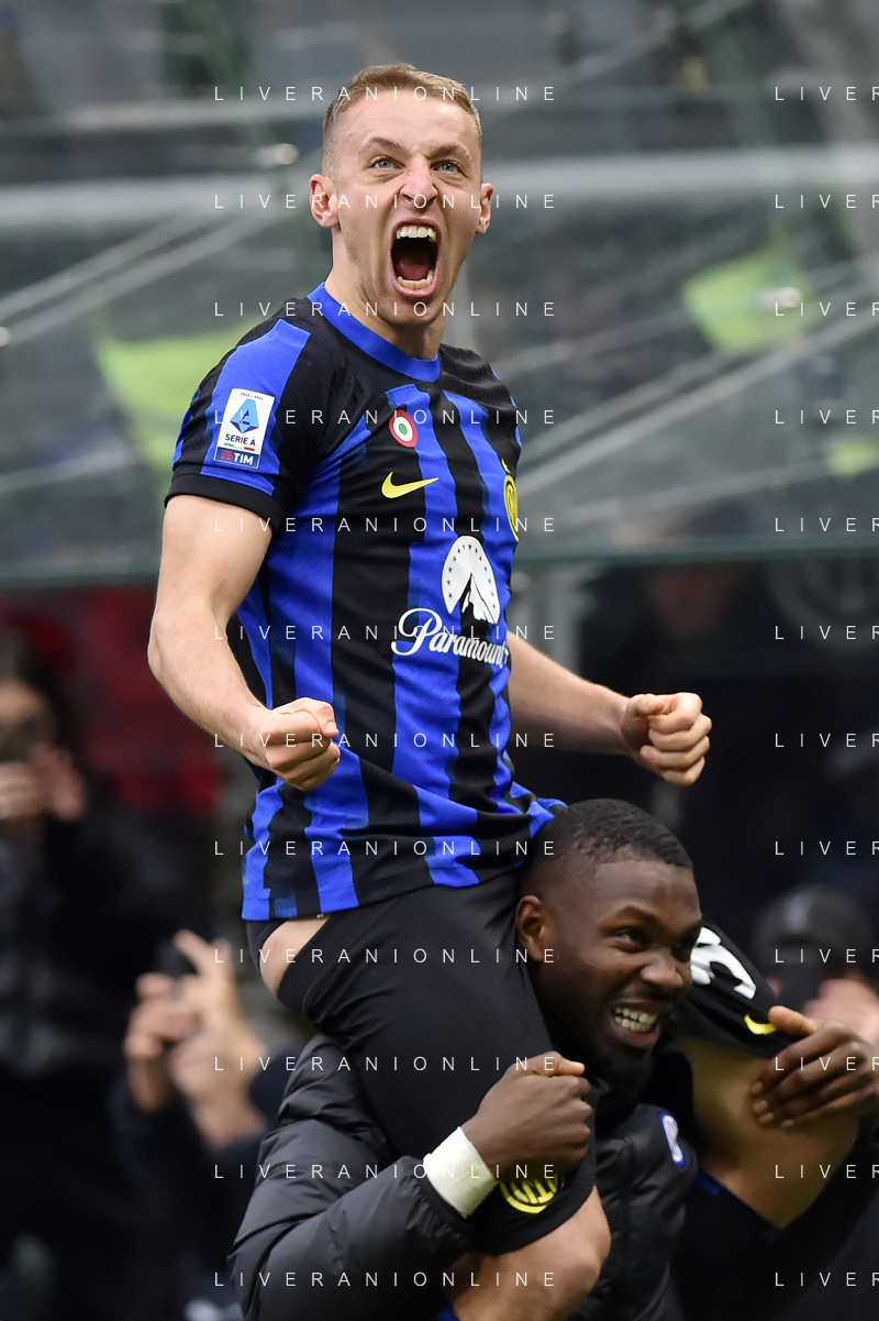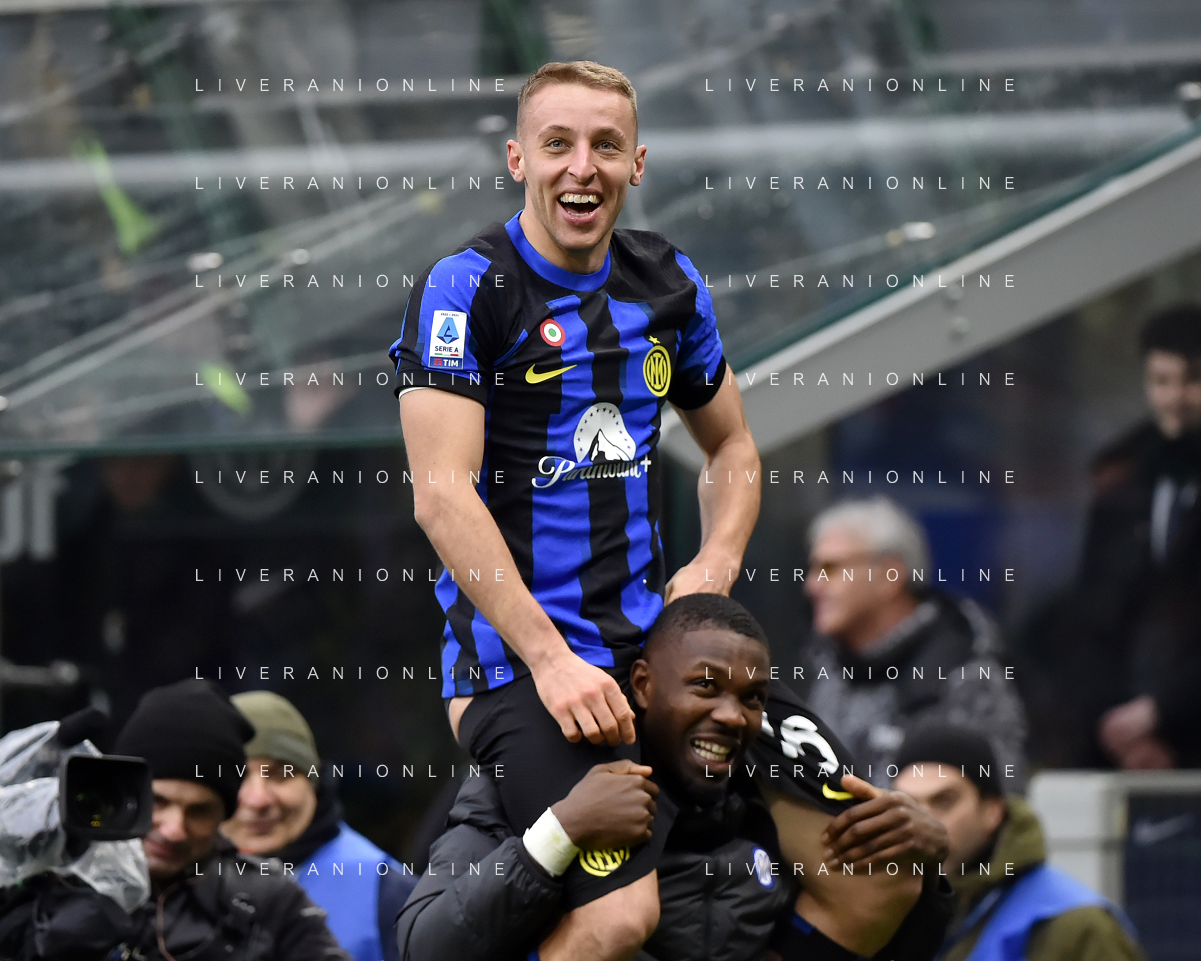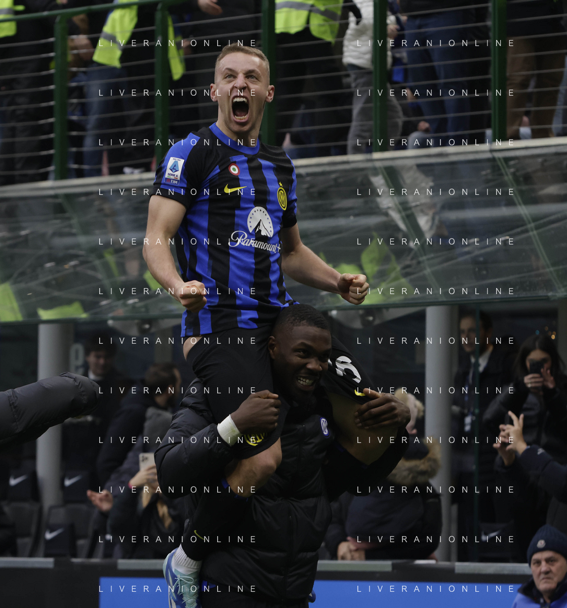 Inter vs Hellas Verona nella foto Davide Frattesi (Inter) esulta dopo il gol del 2 a 1 portato sulle spalle da Marcus Thuram (Inter) Milano 06-01-2024 Stadio Giuseppe Meazza - San Siro Campionato Serie A TIM - 19a giornata foto Roberto Garavaglia/Agenzia Aldo Liverani sas