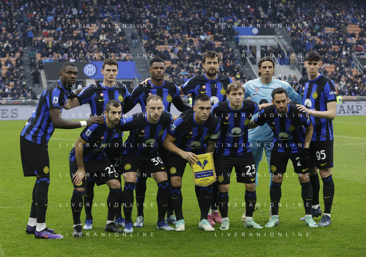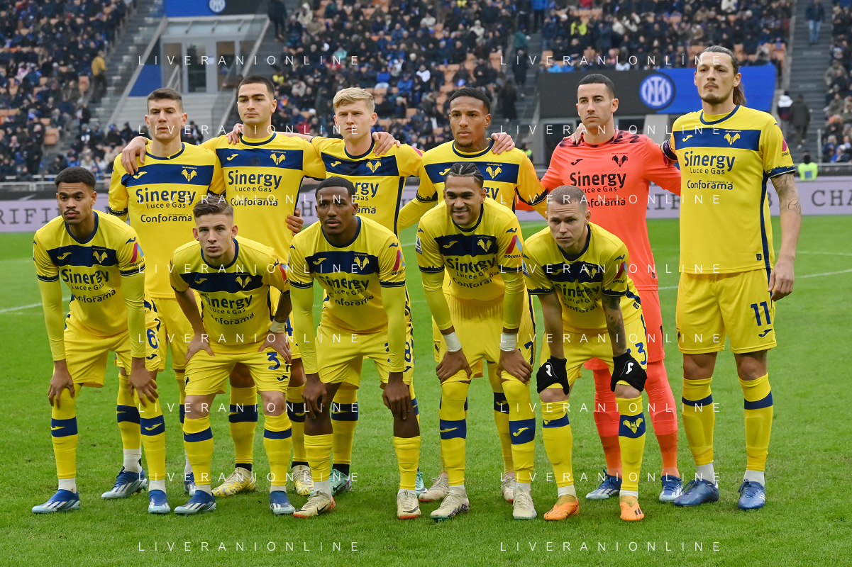 Inter vs Hellas Verona nella foto formazione Hellas Verona, in piedi da SX Giangiacomo Magnani, Diego Coppola, Josh Thomas Doig, Michael Folorunsho, Lorenzo Montipo' e Milan Djuric; in basso da SX Cyril Jean Ngonge, Tomas Suslov, Jackson Tchatchoua, Jordi Mboula e Ondrej Duda Milano 06-01-2024 Stadio Giuseppe Meazza - San Siro Campionato Serie A TIM - 19a giornata foto Roberto Garavaglia/Agenzia Aldo Liverani sas