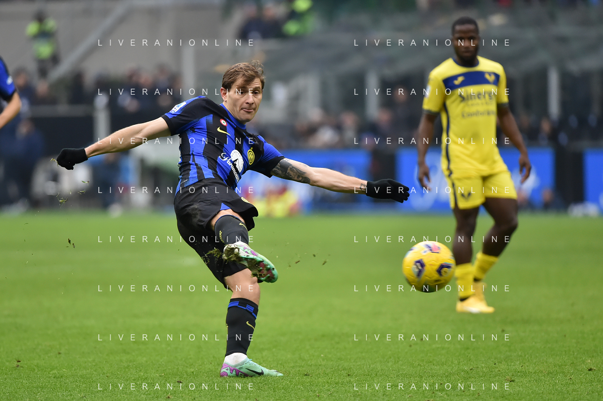 Inter vs Hellas Verona nella foto il tiro di Nicolo' Barella (Inter) ribattuto in rete da Davide Frattesi (Inter) per il gol del 2 a 1 Milano 06-01-2024 Stadio Giuseppe Meazza - San Siro Campionato Serie A TIM - 19a giornata foto Roberto Garavaglia/Agenzia Aldo Liverani sas/AGENZIA ALDO LIVERANI SAS