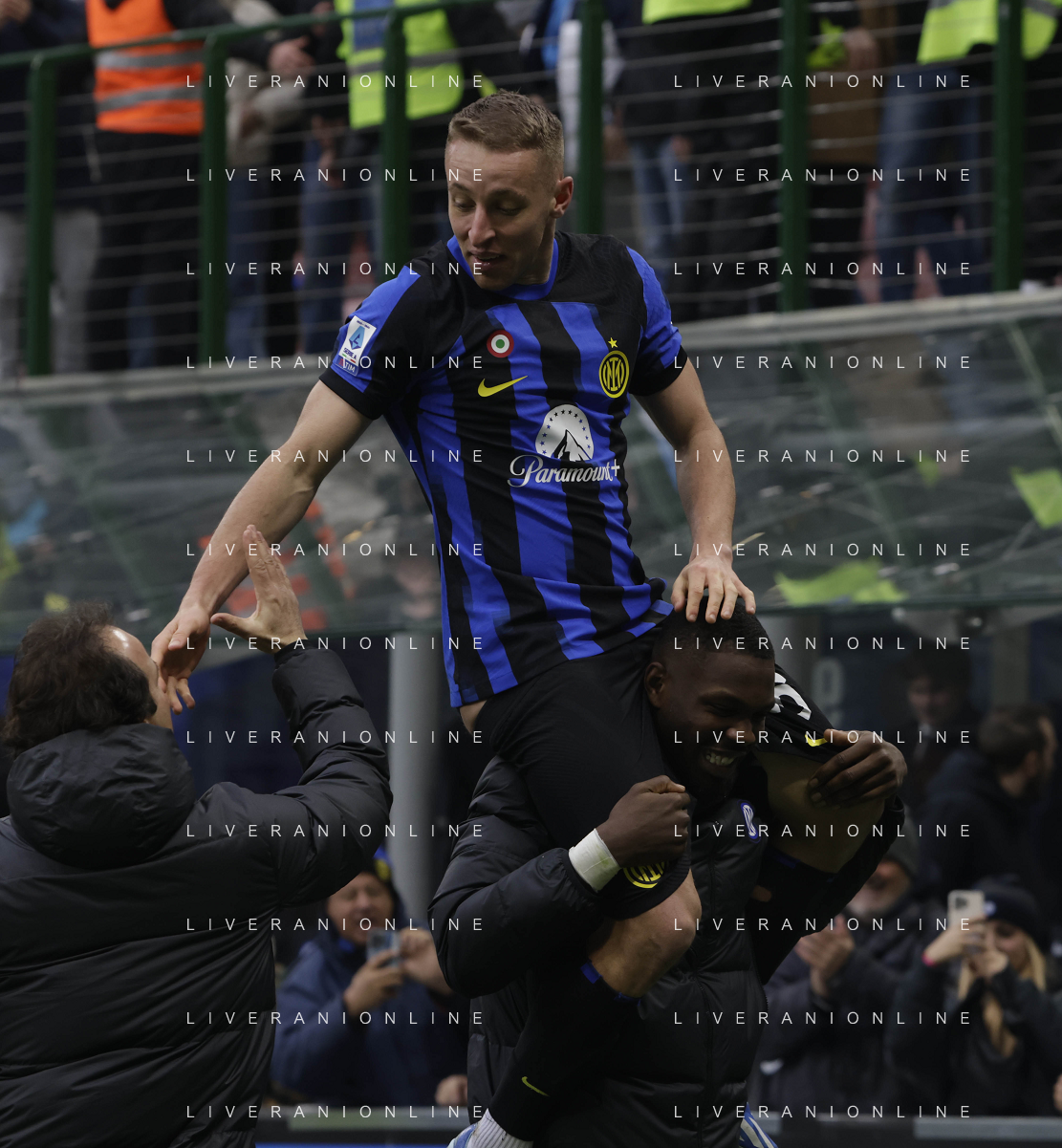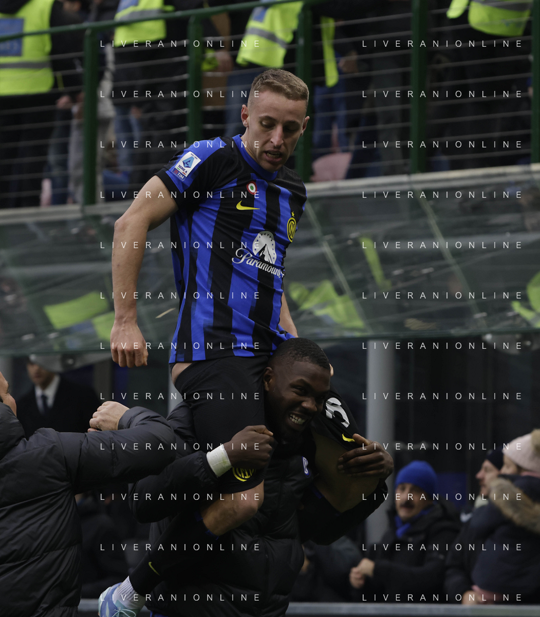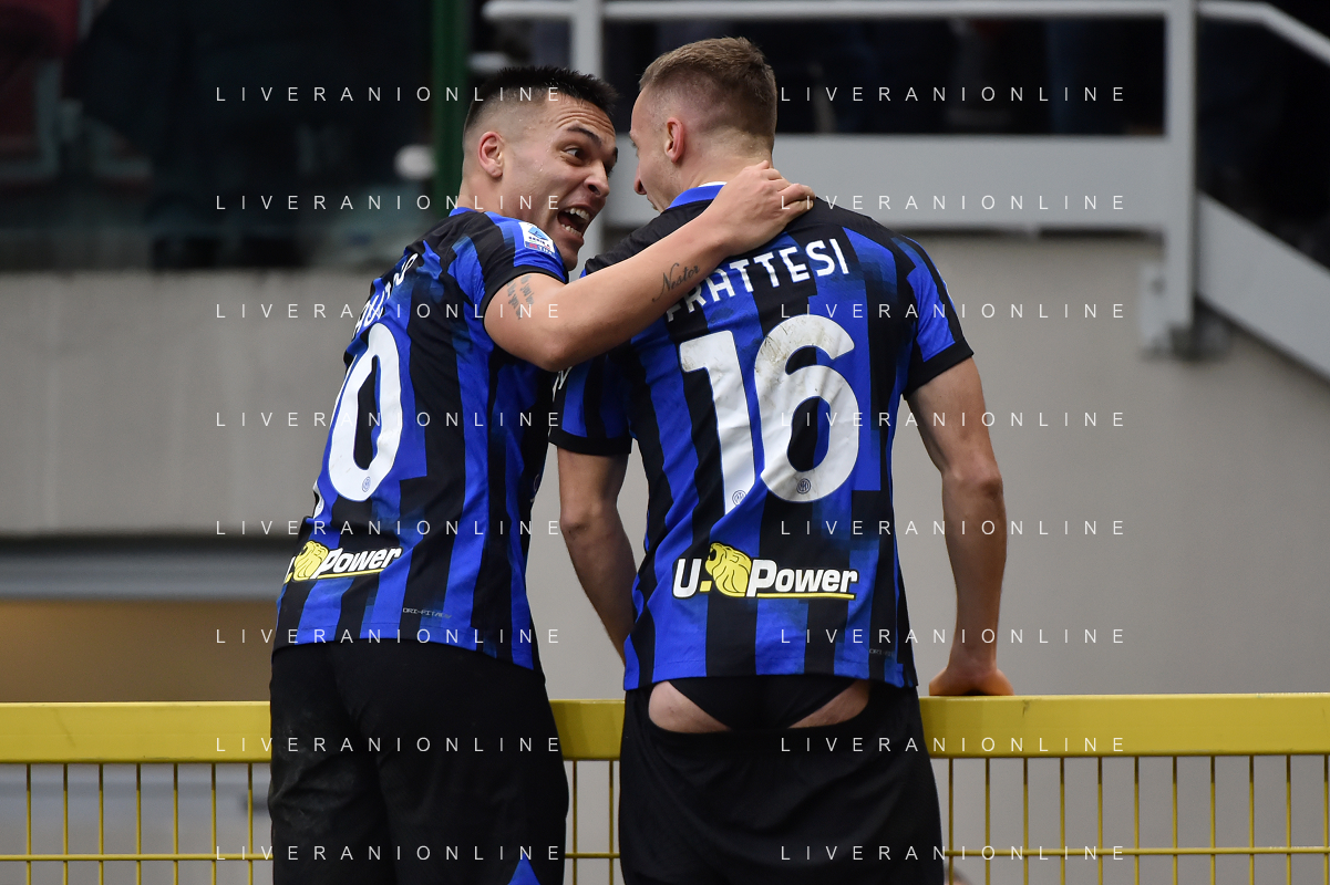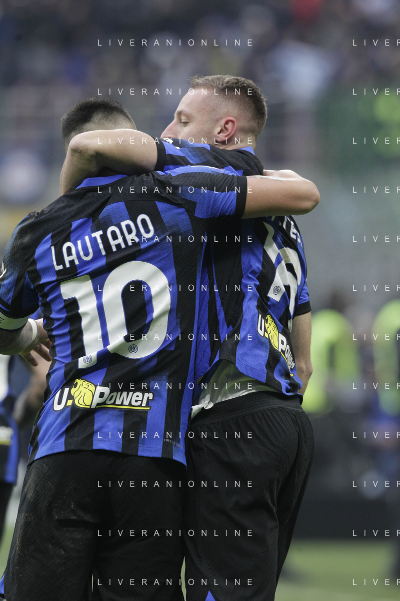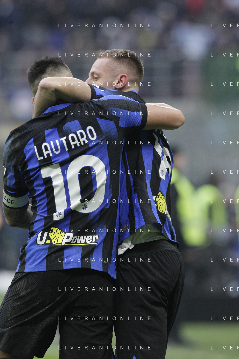 Inter vs Hellas Verona nella foto Lautaro Martinez (Inter) e Davide Frattesi (Inter) esultano dopo il gol del 2 a 1 Milano 06-01-2024 Stadio Giuseppe Meazza - San Siro Campionato Serie A TIM - 19a giornata foto Roberto Garavaglia/Agenzia Aldo Liverani sas/AGENZIA ALDO LIVERANI SAS