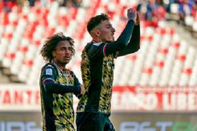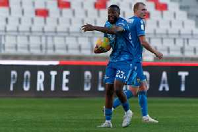Mehdi Dorval of SSC Bari celebrates after scoring a goal with Ismail Achik of SSC Bari/AGENZIA ALDO LIVERANI SAS