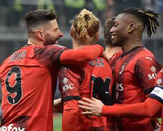 Milan vs Roma nella foto Olivier Giroud (Milan) e Rafael Leao (Milan) esultano dopo il gol del 2 a 0 Milano 14-01-2024 Stadio Giuseppe Meazza - San Siro Campionato Serie A TIM - 20a giornata foto Roberto Garavaglia/Agenzia Aldo Liverani sas
