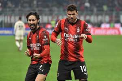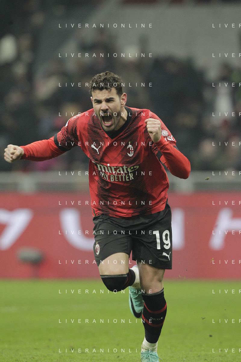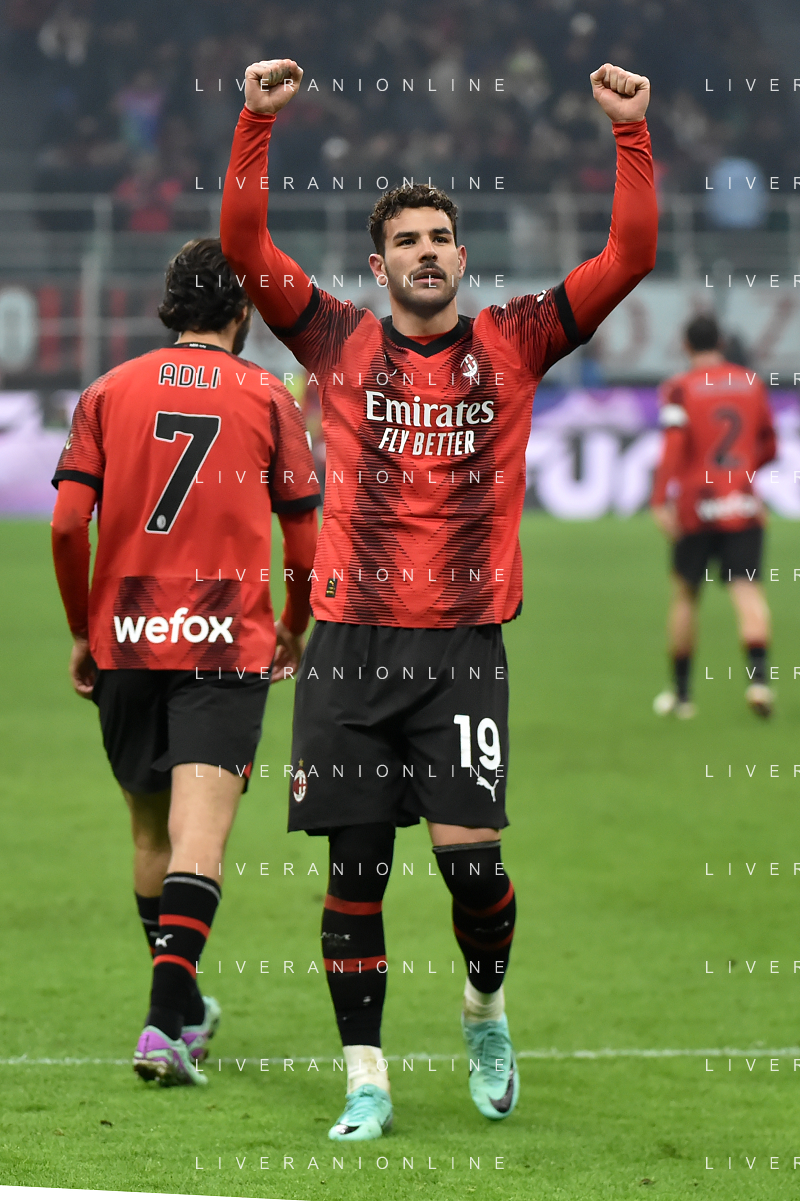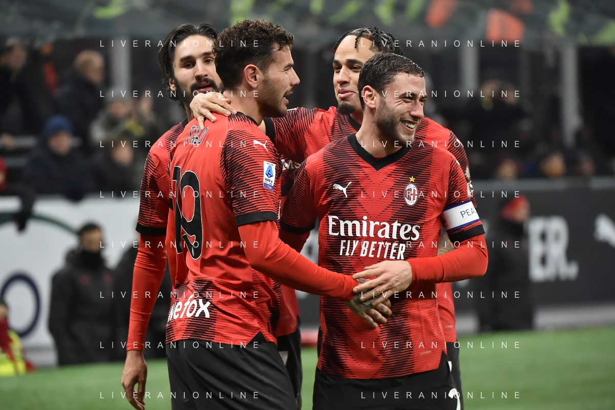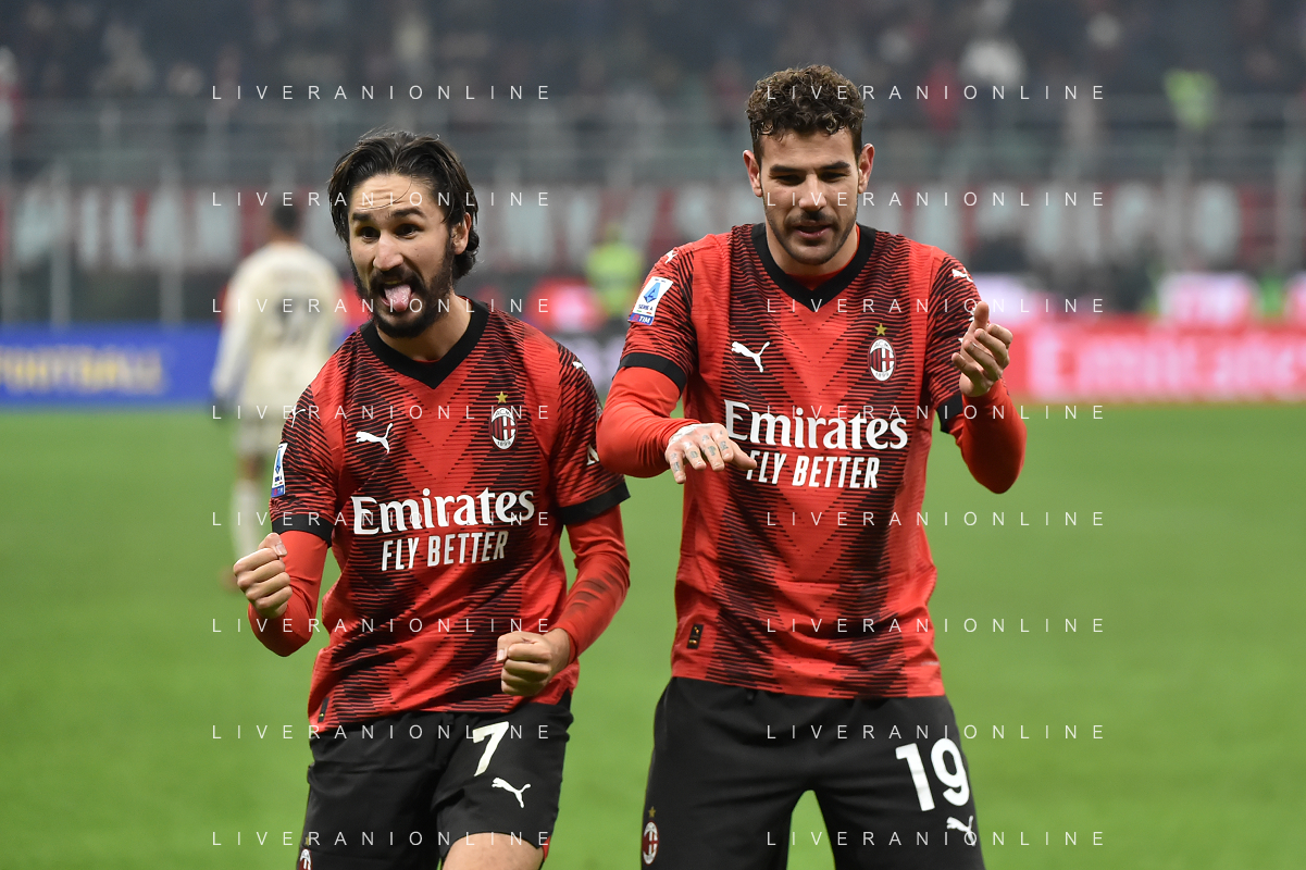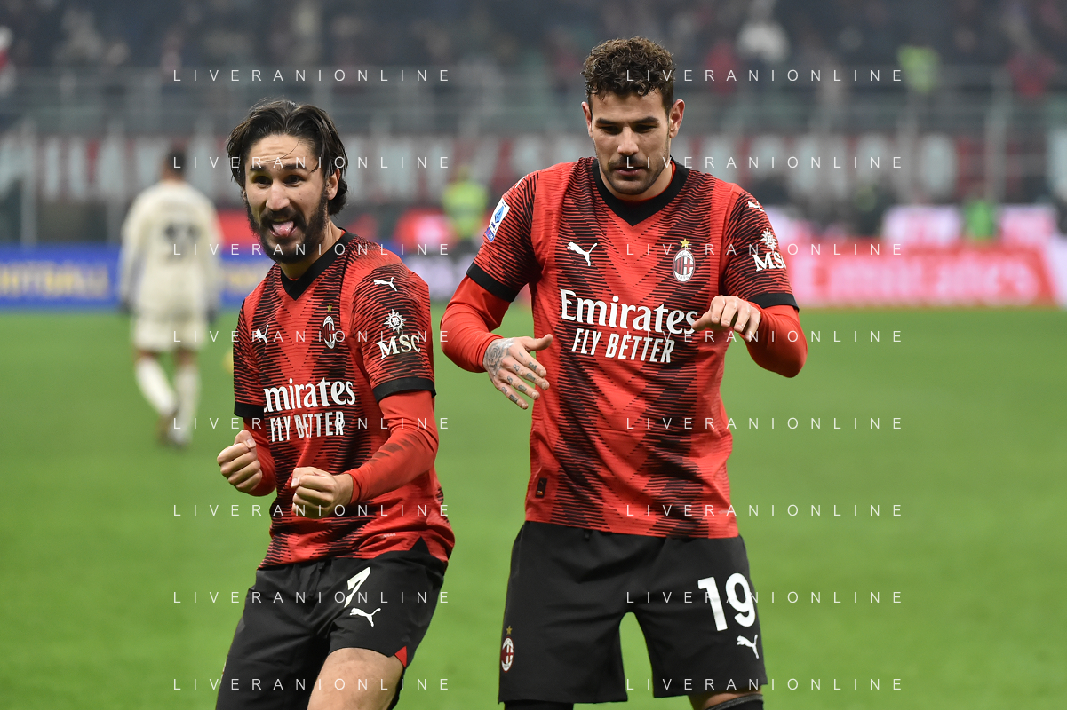 Milan vs Roma nella foto Yacine Adli (Milan) e Theo Hernandez (Milan) esultano dopo il gol del 3 a 1 Milano 14-01-2024 Stadio Giuseppe Meazza - San Siro Campionato Serie A TIM - 20a giornata foto Roberto Garavaglia/Agenzia Aldo Liverani sas/AGENZIA ALDO LIVERANI SAS