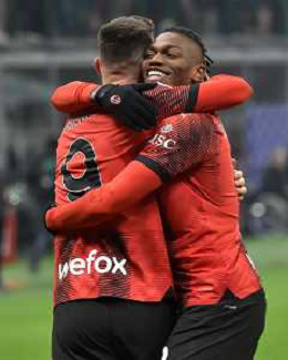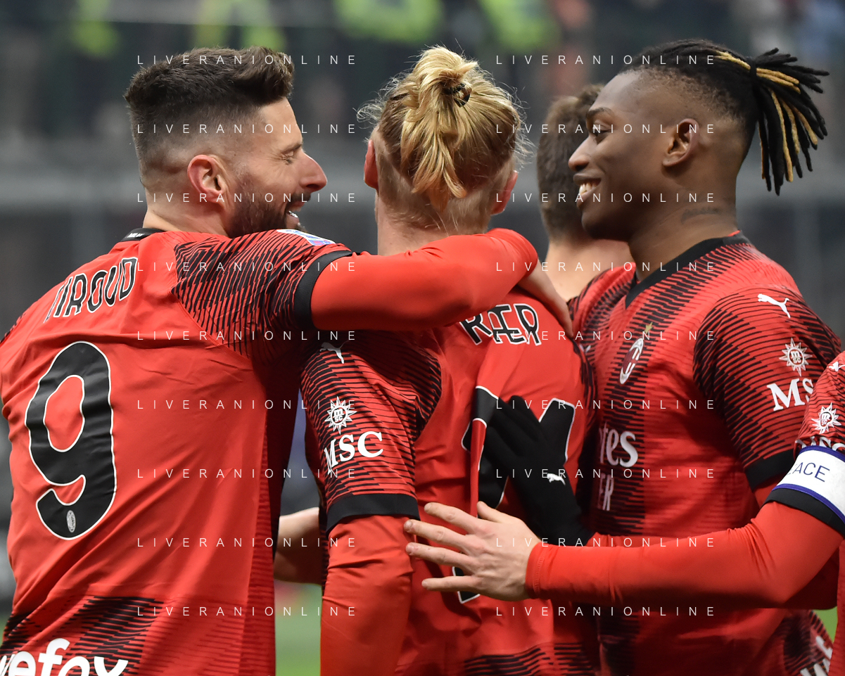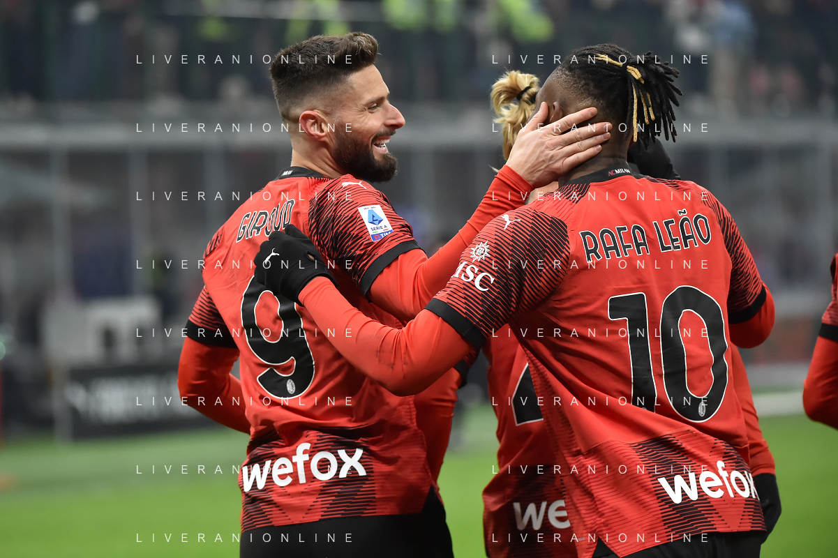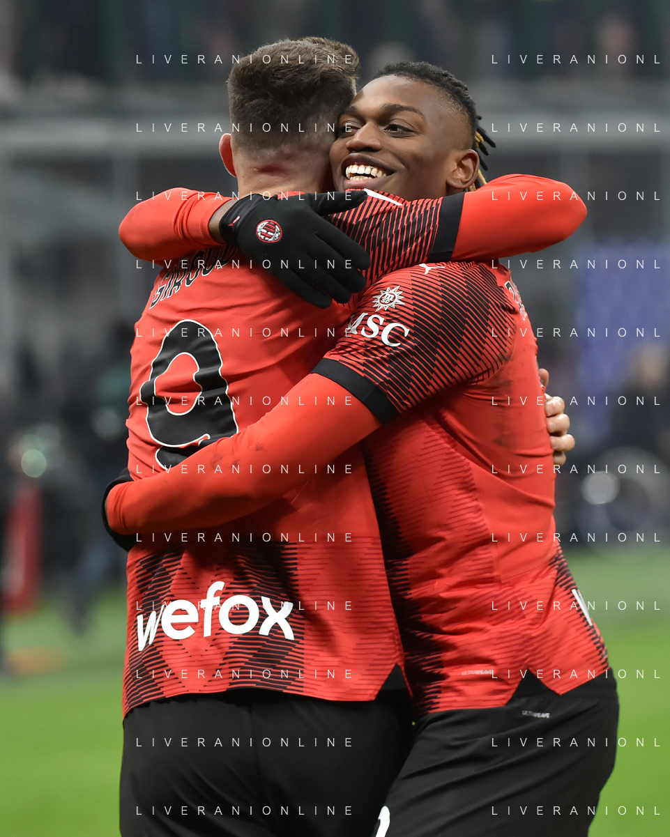 Milan vs Roma nella foto Olivier Giroud (Milan) e Rafael Leao (Milan) esultano dopo il gol del 2 a 0 Milano 14-01-2024 Stadio Giuseppe Meazza - San Siro Campionato Serie A TIM - 20a giornata foto Roberto Garavaglia/Agenzia Aldo Liverani sas/AGENZIA ALDO LIVERANI SAS