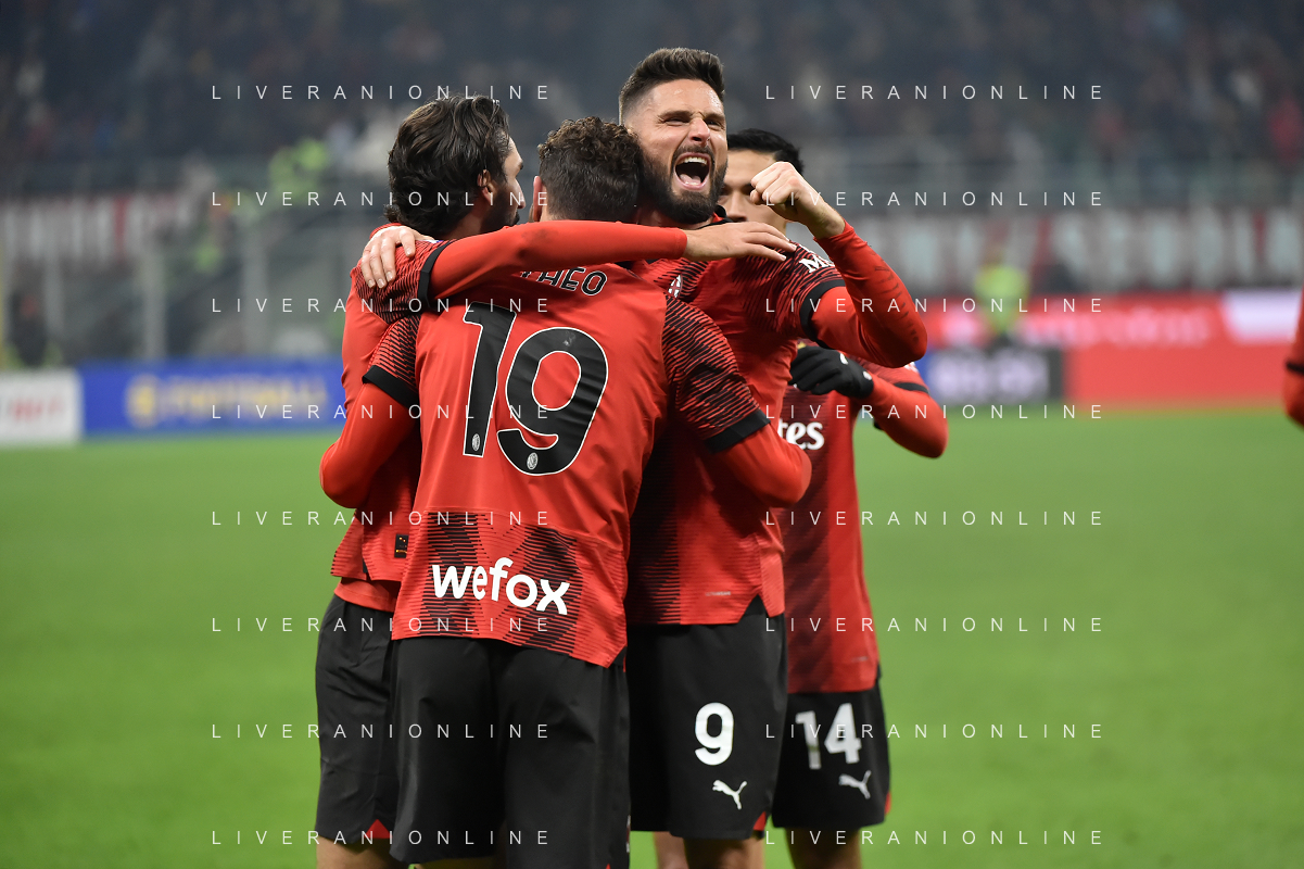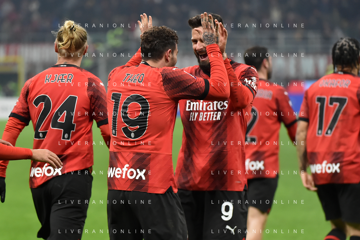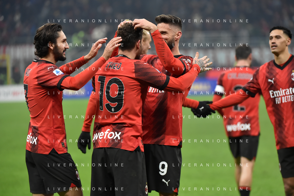 Milan vs Roma nella foto Theo Hernandez (Milan) e Olivier Giroud (Milan) esultano dopo il gol del 3 a 1 Milano 14-01-2024 Stadio Giuseppe Meazza - San Siro Campionato Serie A TIM - 20a giornata foto Roberto Garavaglia/Agenzia Aldo Liverani sas/AGENZIA ALDO LIVERANI SAS