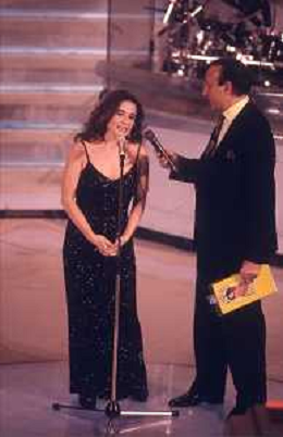 DIAP-RETROSPETTIVA LINA SASTRI ATTRICE E CANTANTE NELLA FOTO LINA SASTRI AL FESTIVAL DI SANREMO NELL'ANNO 1992 CON PIPPO BAUDO AG ALDO LIVERANI SAS