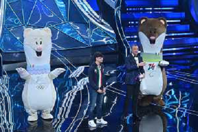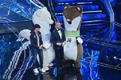 Festival Sanremo 2024 nella foto le mascotte di Milano Cortina 2026 74mo Festival della Canzone Italiana - Seconda Serata Teatro Ariston - Sanremo (IM) 07-02-2024 foto Roberto Garavaglia/agenzia Aldo Liverani sas/AGENZIA ALDO LIVERANI SAS